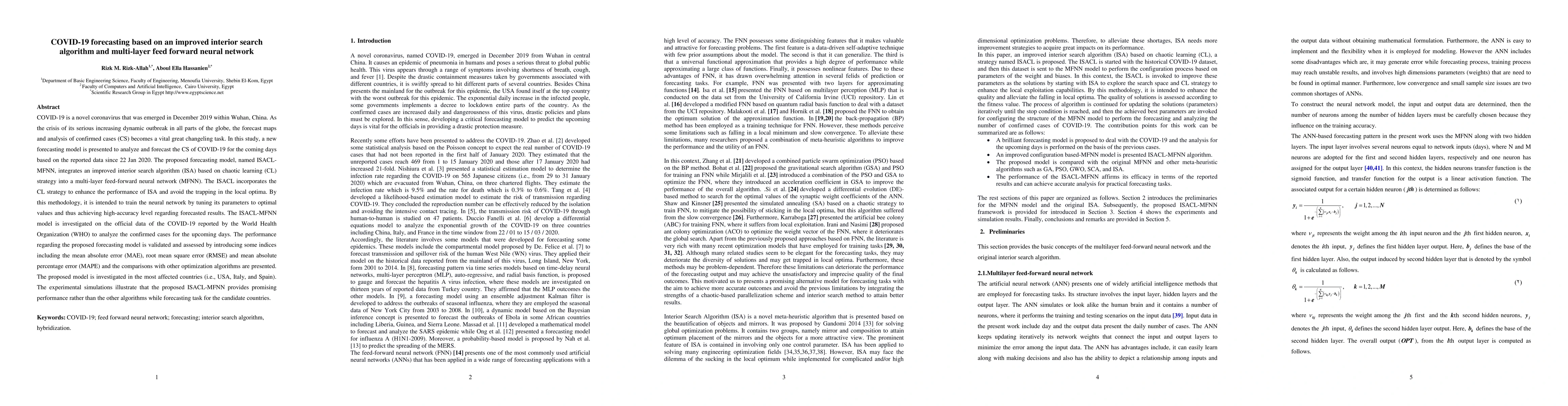 COVID-19 is a novel coronavirus that was emerged in December 2019 within Wuhan, China. As the crisis of its serious increasing dynamic outbreak in all parts of the globe, the forecast maps and analysis of confirmed cases (CS) becomes a vital great changeling task. In this study, a new forecasting model is presented to analyze and forecast the CS of COVID-19 for the coming days based on the reported data since 22 Jan 2020. The proposed forecasting model, named ISACL-MFNN, integrates an improved interior search algorithm (ISA) based on chaotic learning (CL) strategy into a multi-layer feed-forward neural network (MFNN). The ISACL incorporates the CL strategy to enhance the performance of ISA and avoid the trapping in the local optima. By this methodology, it is intended to train the neural network by tuning its parameters to optimal values and thus achieving high-accuracy level regarding forecasted results. The ISACL-MFNN model is investigated on the official data of the COVID-19 reported by the World Health Organization (WHO) to analyze the confirmed cases for the upcoming days. The performance regarding the proposed forecasting model is validated and assessed by introducing some indices including the mean absolute error (MAE), root mean square error (RMSE) and mean absolute percentage error (MAPE) and the comparisons with other optimization algorithms are presented. The proposed model is investigated in the most affected countries (i.e., USA, Italy, and Spain). The experimental simulations illustrate that the proposed ISACL-MFNN provides promising performance rather than the other algorithms while forecasting task for the candidate countries.