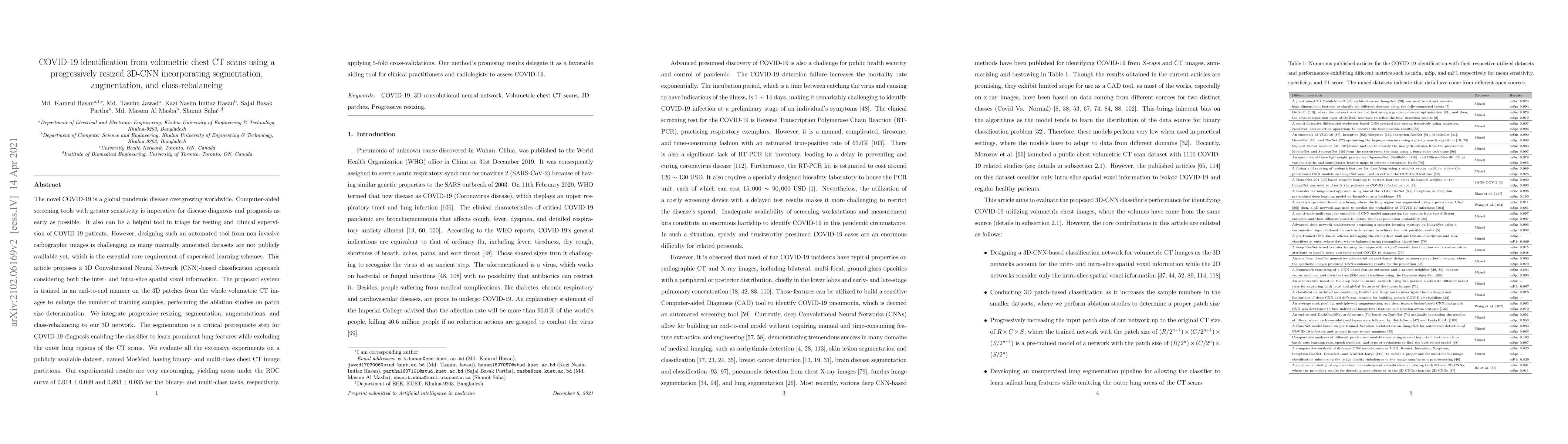 This paper proposes a 3D CNN-based method for COVID-19 identification using volumetric chest CT scans, integrating segmentation, data augmentation, and class-rebalancing to enhance training. Experimental results show high accuracy, with ROC-AUC scores of 0.914 and 0.893 for binary and multi-class classification, respectively.
