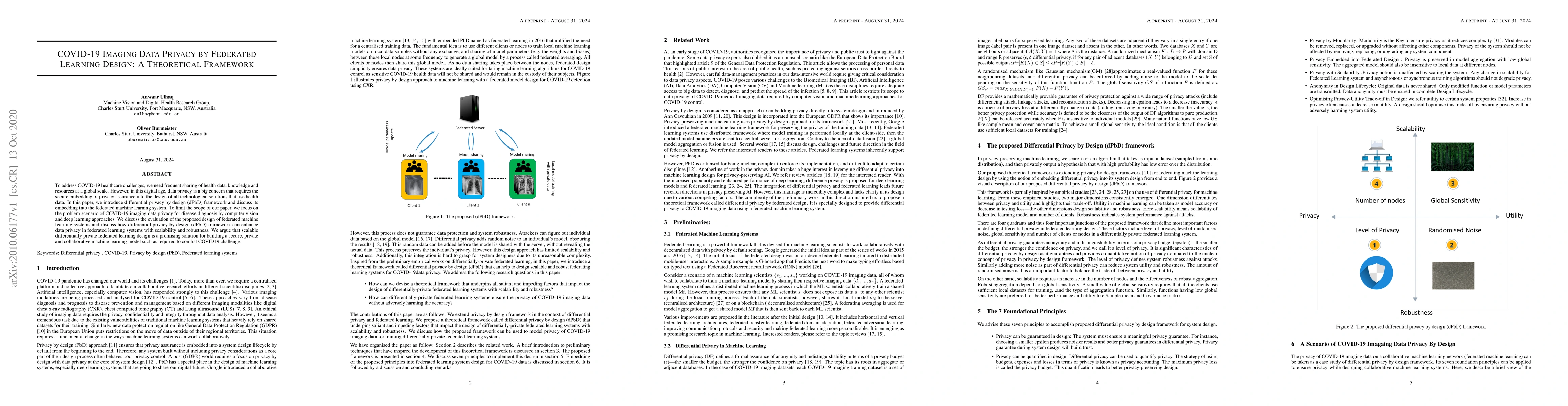 This paper proposes a differential privacy by design (dPbD) framework integrated into federated machine learning systems to enhance the privacy of COVID-19 imaging data used for disease diagnosis. The study argues that this scalable, differentially private federated learning design offers a secure, collaborative solution to combat COVID-19 challenges.