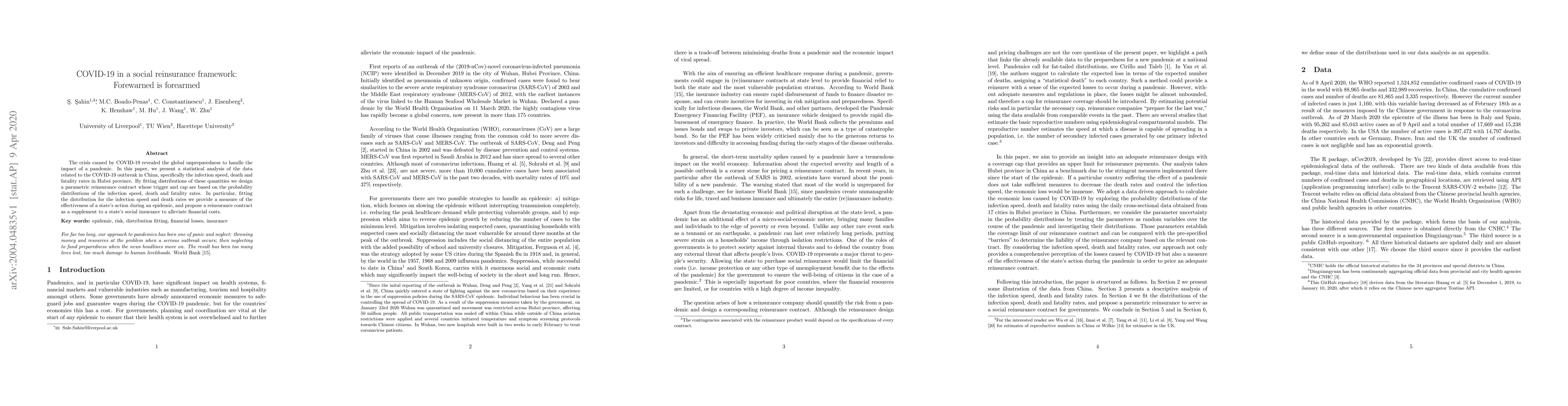 The crisis caused by COVID-19 revealed the global unpreparedness to handle the impact of a pandemic. In this paper, we present a statistical analysis of the data related to the COVID-19 outbreak in China, specifically the infection speed, death and fatality rates in Hubei province. By fitting distributions of these quantities we design a parametric reinsurance contract whose trigger and cap are based on the probability distributions of the infection speed, death and fatality rates. In particular, fitting the distribution for the infection speed and death rates we provide a measure of the effectiveness of a state's action during an epidemic, and propose a reinsurance contract as a supplement to a state's social insurance to alleviate financial costs.