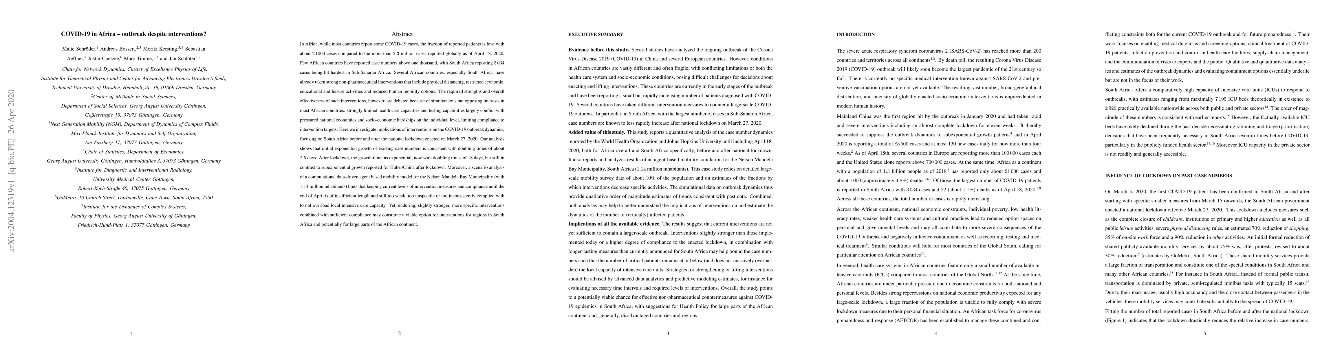 Few African countries have reported COVID-19 case numbers above $1\,000$ as of April 18, 2020, with South Africa reporting $3\,034$ cases being hit hardest in Sub-Saharan Africa. Several African countries, especially South Africa, have already taken strong non-pharmaceutical interventions that include physical distancing, restricted economic, educational and leisure activities and reduced human mobility options. The required strengths and overall effectiveness of such interventions, however, are debated because of simultaneous but opposing interests in most African countries: strongly limited health care capacities and testing capabilities largely conflict with pressured national economies and socio-economic hardships on the individual level, limiting compliance to intervention targets. Here we investigate implications of interventions on the COVID-19 outbreak dynamics, focusing on South Africa before and after the national lockdown enacted on March 27, 2020. Our analysis shows that initial exponential growth of existing case numbers is consistent with doubling times of about $2.5$ days. After lockdown, the growth remains exponential, now with doubling times of 18 days, but still in contrast to subexponential growth reported for Hubei/China after lockdown. Moreover, a scenario analysis of a computational data-driven agent based mobility model for the Nelson Mandela Bay Municipality (with $1.14$ million inhabitants) hints that keeping current levels of intervention measures and compliance until the end of April is of insufficient length and still too weak, too unspecific or too inconsistently complied with to not overload local intensive care capacity. Yet, enduring, slightly stronger, more specific interventions combined with sufficient compliance may constitute a viable option for interventions for regions in South Africa and potentially for large parts of the African continent.