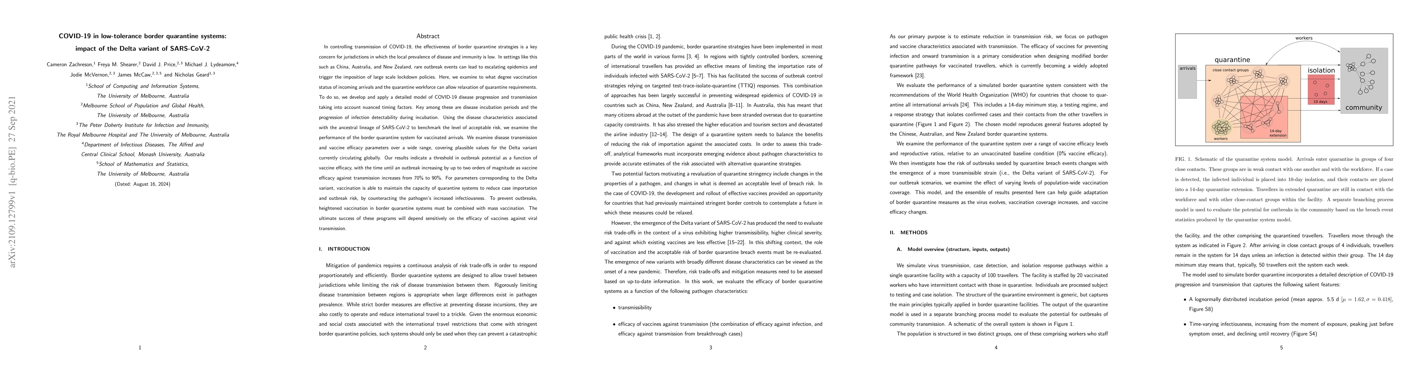 A study examines the impact of the Delta variant of SARS-CoV-2 on border quarantine systems in low-tolerance areas and finds that vaccination can maintain system effectiveness by up to two orders of magnitude as vaccine efficacy increases from 70% to 90%.