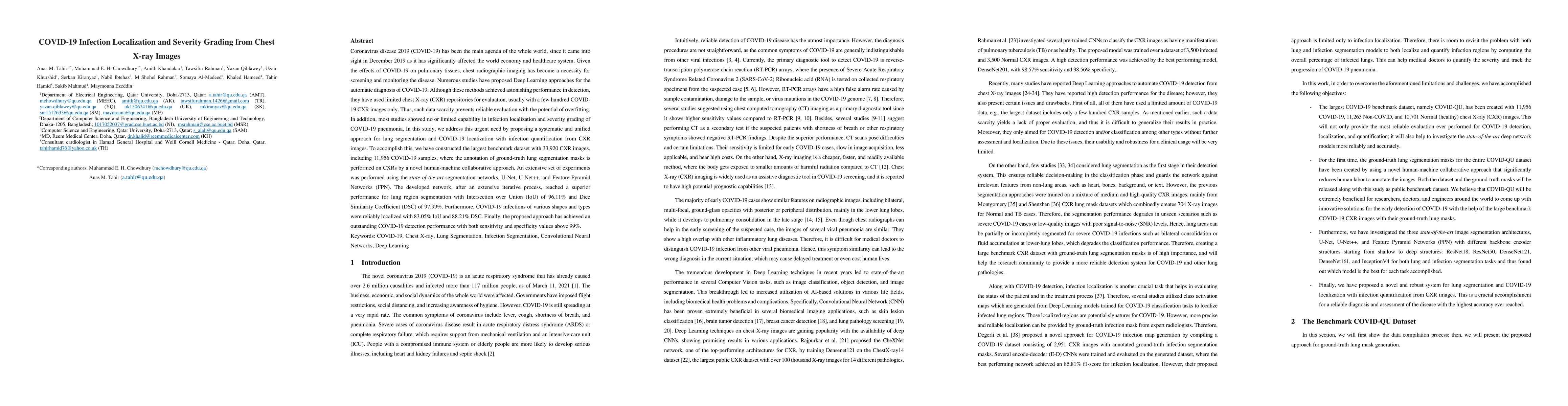 Coronavirus disease 2019 (COVID-19) has been the main agenda of the whole world, since it came into sight in December 2019 as it has significantly affected the world economy and healthcare system. Given the effects of COVID-19 on pulmonary tissues, chest radiographic imaging has become a necessity for screening and monitoring the disease. Numerous studies have proposed Deep Learning approaches for the automatic diagnosis of COVID-19. Although these methods achieved astonishing performance in detection, they have used limited chest X-ray (CXR) repositories for evaluation, usually with a few hundred COVID-19 CXR images only. Thus, such data scarcity prevents reliable evaluation with the potential of overfitting. In addition, most studies showed no or limited capability in infection localization and severity grading of COVID-19 pneumonia. In this study, we address this urgent need by proposing a systematic and unified approach for lung segmentation and COVID-19 localization with infection quantification from CXR images. To accomplish this, we have constructed the largest benchmark dataset with 33,920 CXR images, including 11,956 COVID-19 samples, where the annotation of ground-truth lung segmentation masks is performed on CXRs by a novel human-machine collaborative approach. An extensive set of experiments was performed using the state-of-the-art segmentation networks, U-Net, U-Net++, and Feature Pyramid Networks (FPN). The developed network, after an extensive iterative process, reached a superior performance for lung region segmentation with Intersection over Union (IoU) of 96.11% and Dice Similarity Coefficient (DSC) of 97.99%. Furthermore, COVID-19 infections of various shapes and types were reliably localized with 83.05% IoU and 88.21% DSC. Finally, the proposed approach has achieved an outstanding COVID-19 detection performance with both sensitivity and specificity values above 99%.