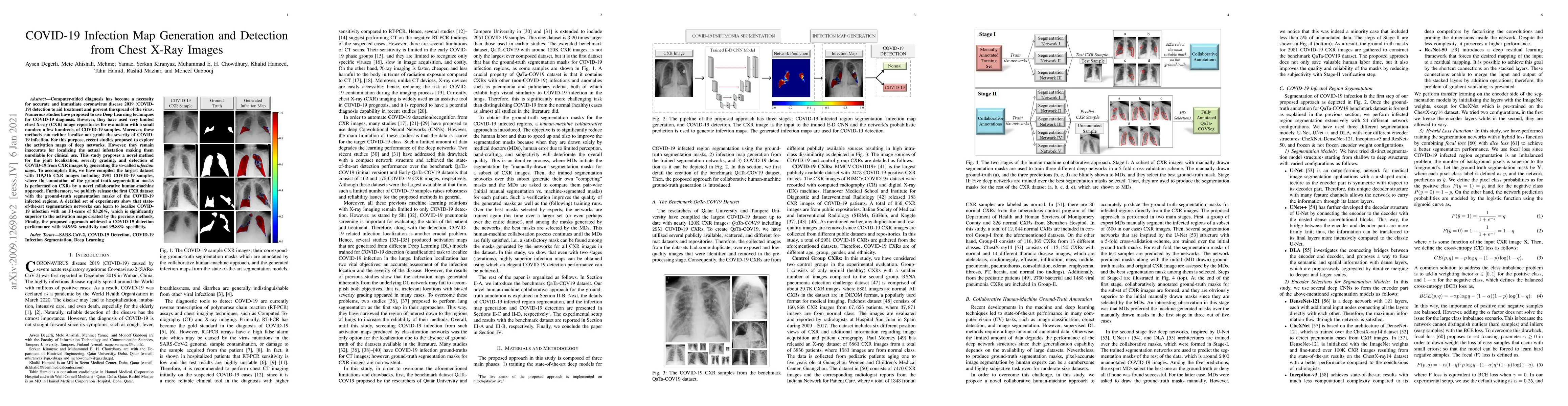 Computer-aided diagnosis has become a necessity for accurate and immediate coronavirus disease 2019 (COVID-19) detection to aid treatment and prevent the spread of the virus. Numerous studies have proposed to use Deep Learning techniques for COVID-19 diagnosis. However, they have used very limited chest X-ray (CXR) image repositories for evaluation with a small number, a few hundreds, of COVID-19 samples. Moreover, these methods can neither localize nor grade the severity of COVID-19 infection. For this purpose, recent studies proposed to explore the activation maps of deep networks. However, they remain inaccurate for localizing the actual infestation making them unreliable for clinical use. This study proposes a novel method for the joint localization, severity grading, and detection of COVID-19 from CXR images by generating the so-called infection maps. To accomplish this, we have compiled the largest dataset with 119,316 CXR images including 2951 COVID-19 samples, where the annotation of the ground-truth segmentation masks is performed on CXRs by a novel collaborative human-machine approach. Furthermore, we publicly release the first CXR dataset with the ground-truth segmentation masks of the COVID-19 infected regions. A detailed set of experiments show that state-of-the-art segmentation networks can learn to localize COVID-19 infection with an F1-score of 83.20%, which is significantly superior to the activation maps created by the previous methods. Finally, the proposed approach achieved a COVID-19 detection performance with 94.96% sensitivity and 99.88% specificity.