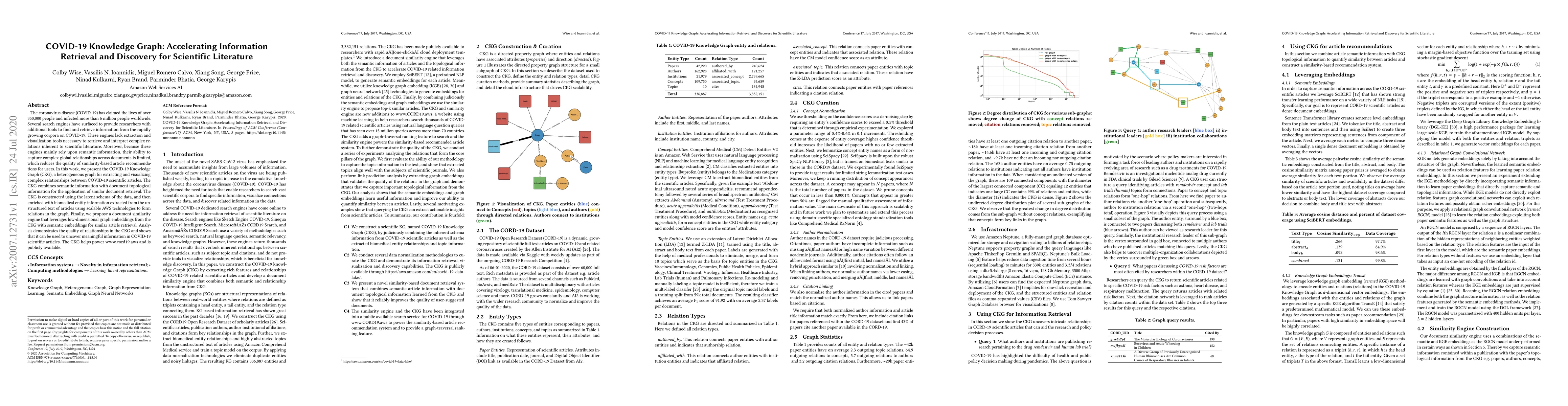 The COVID-19 Knowledge Graph (CKG) enhances information retrieval and discovery in scientific literature by extracting and visualizing complex relationships between COVID-19 articles, combining semantic and topological data, and leveraging graph embeddings for improved document similarity. The CKG is publicly available and supports the www.cord19.aws platform.