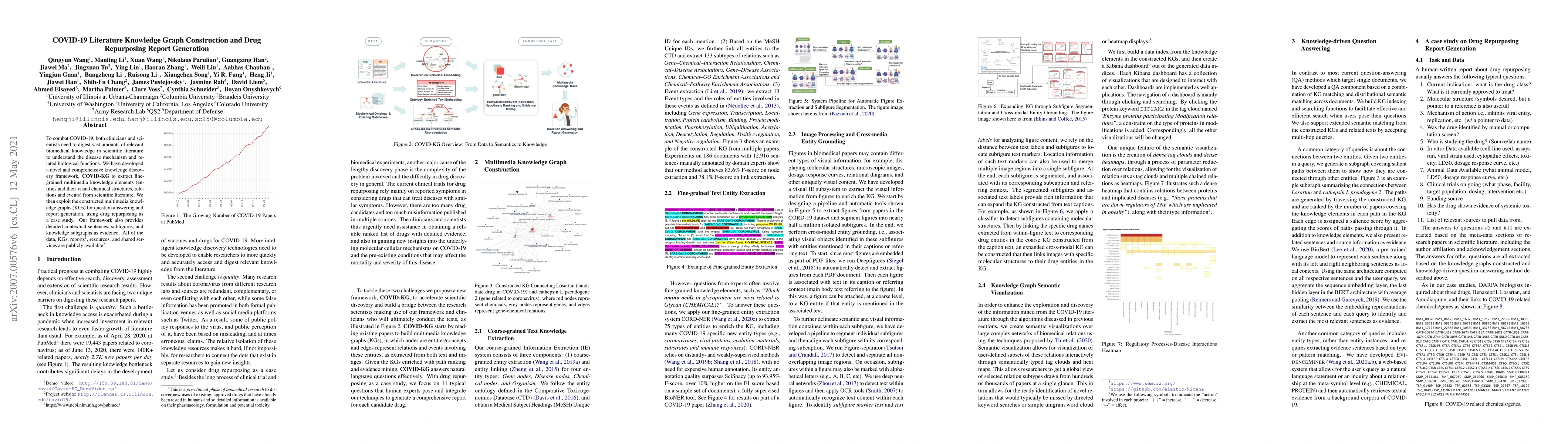 The COVID-KG framework extracts fine-grained multimedia knowledge from scientific literature to construct comprehensive knowledge graphs, which are then used for question answering and report generation, specifically demonstrating drug repurposing potential against COVID-19. The framework provides detailed contextual evidence including sentences, figures, and subgraphs.