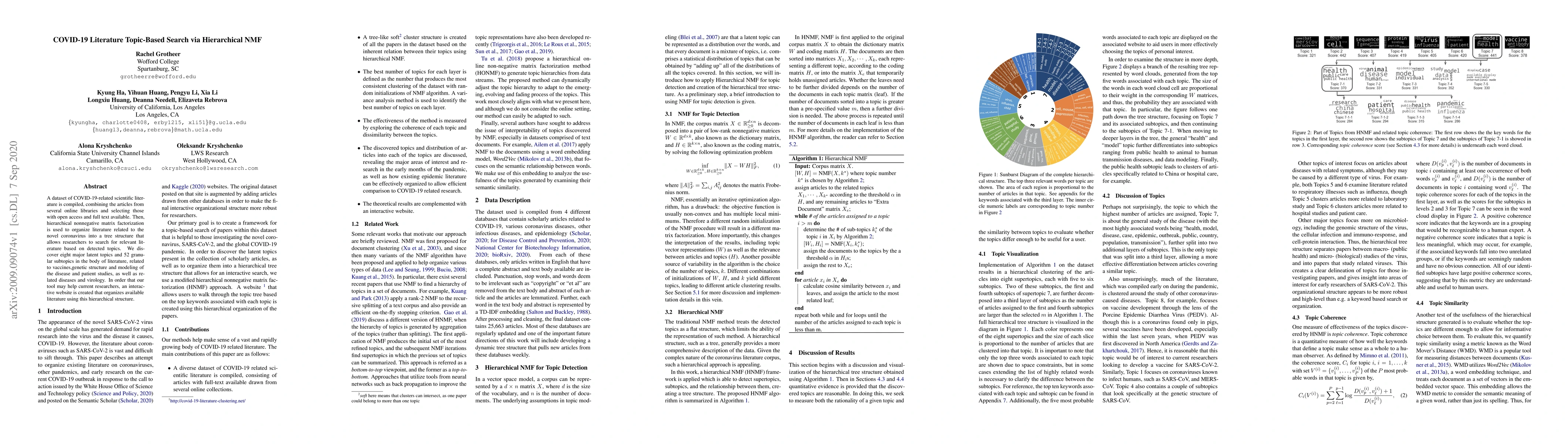 This paper compiles open-access COVID-19 literature and employs hierarchical nonnegative matrix factorization to categorize it into a tree structure with eight major topics and 52 subtopics. An interactive website is developed to facilitate researcher access to this organized literature.