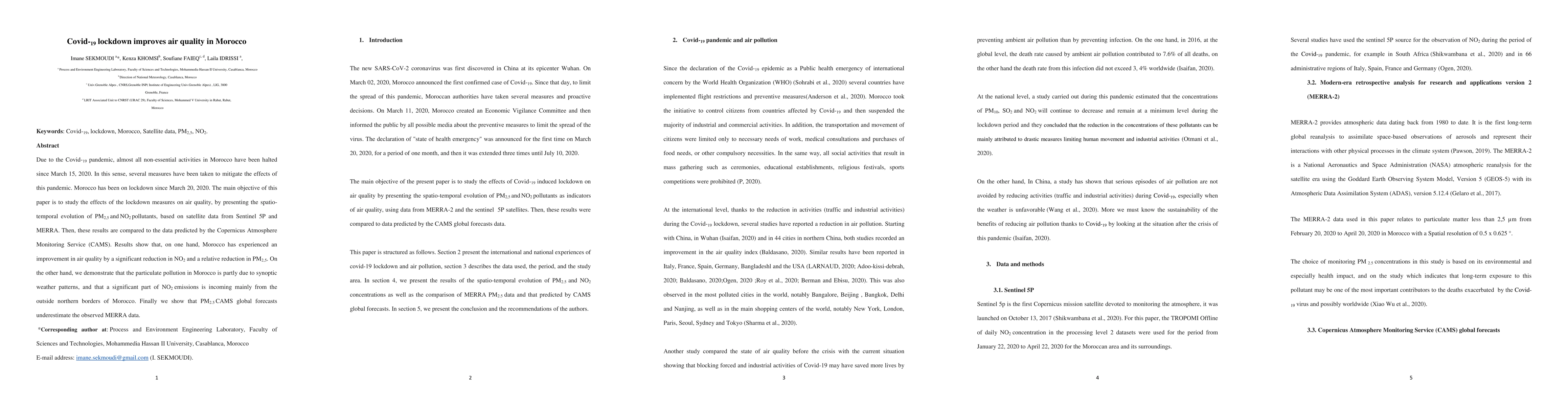 A study found that Morocco's Covid-19 lockdown improved air quality due to a significant reduction in NO2 and PM2.5 pollutants. However, the country's particulate pollution is partly influenced by external factors and global forecast models underestimate local emissions.