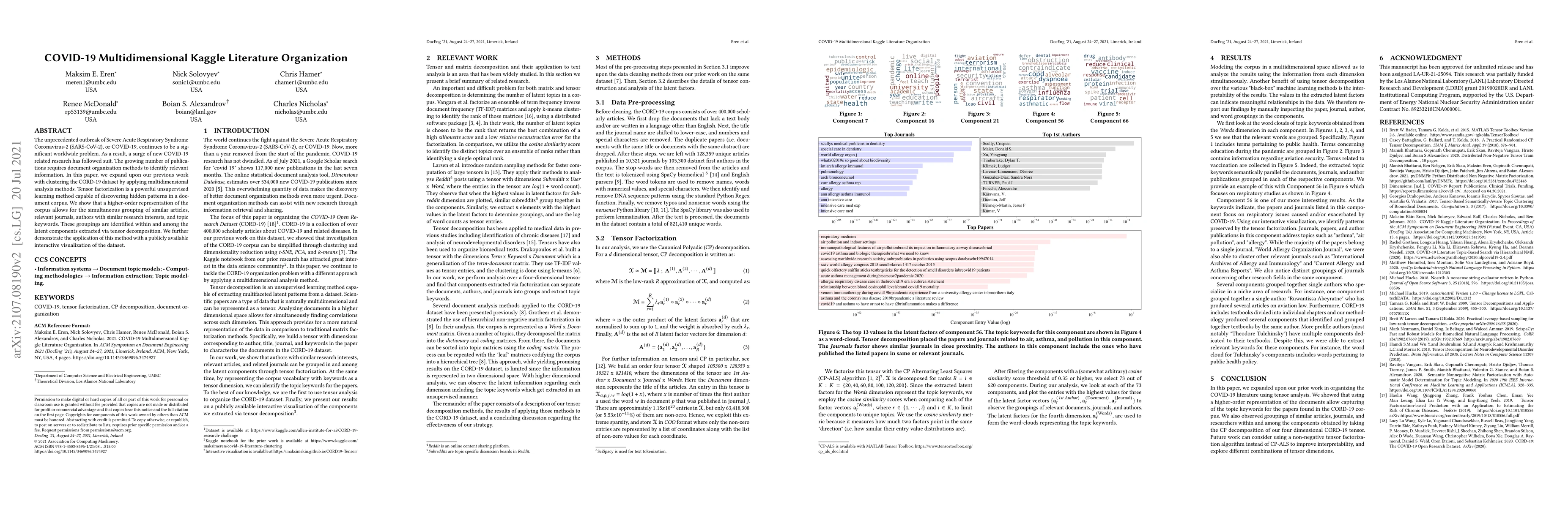 The unprecedented outbreak of Severe Acute Respiratory Syndrome Coronavirus-2 (SARS-CoV-2), or COVID-19, continues to be a significant worldwide problem. As a result, a surge of new COVID-19 related research has followed suit. The growing number of publications requires document organization methods to identify relevant information. In this paper, we expand upon our previous work with clustering the CORD-19 dataset by applying multi-dimensional analysis methods. Tensor factorization is a powerful unsupervised learning method capable of discovering hidden patterns in a document corpus. We show that a higher-order representation of the corpus allows for the simultaneous grouping of similar articles, relevant journals, authors with similar research interests, and topic keywords. These groupings are identified within and among the latent components extracted via tensor decomposition. We further demonstrate the application of this method with a publicly available interactive visualization of the dataset.
