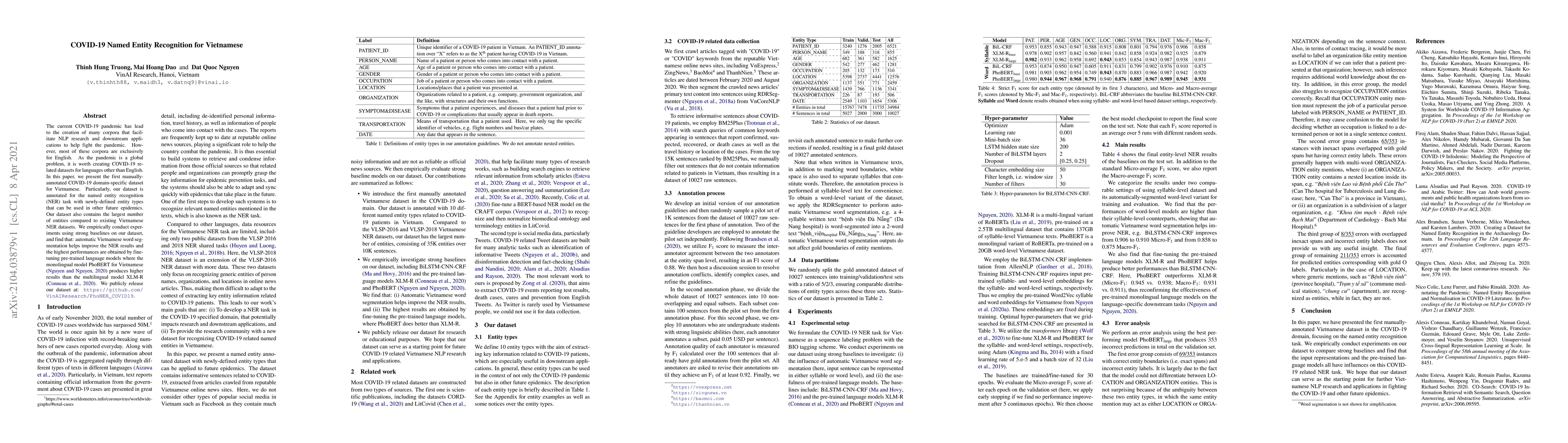 This paper introduces the first manually-annotated Vietnamese COVID-19 named entity recognition dataset, which includes the largest number of entities compared to existing datasets. Experiments show that fine-tuning the monolingual PhoBERT model yields better results than the multilingual XLM-R model for Vietnamese NER tasks.