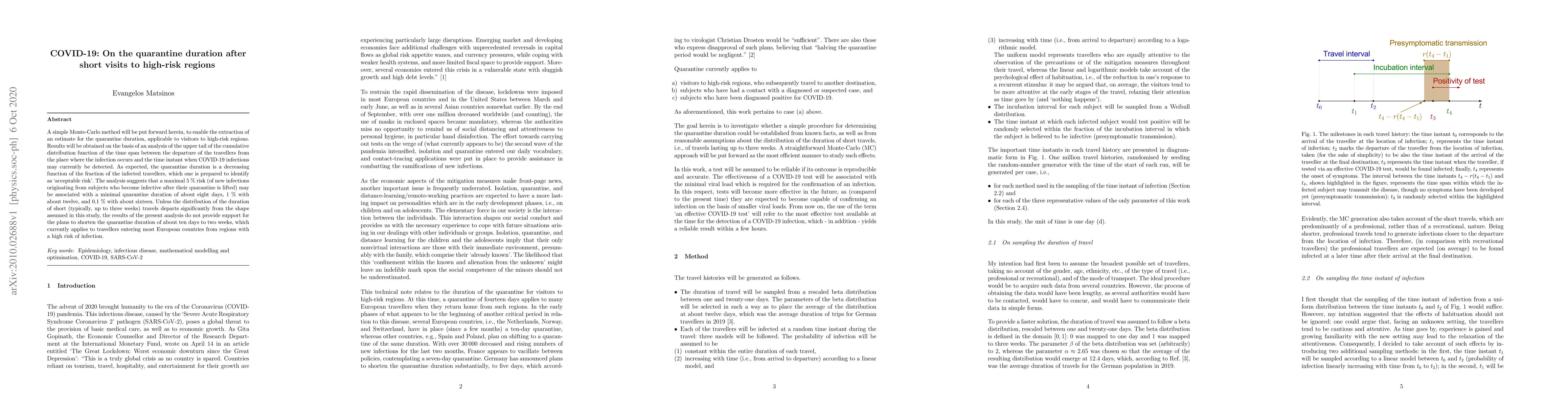 A simple Monte-Carlo method will be put forward herein, to enable the extraction of an estimate for the quarantine duration, applicable to visitors to high-risk regions. Results will be obtained on the basis of an analysis of the upper tail of the cumulative distribution function of the time span between the departure of the travellers from the place where the infection occurs and the time instant when COVID-19 infections may currently be detected. As expected, the quarantine duration is a decreasing function of the fraction of the infected travellers, which one is prepared to identify as `acceptable risk'. The analysis suggests that a maximal $5~\%$ risk (of new infections originating from subjects who become infective after their quarantine is lifted) may be associated with a minimal quarantine duration of about eight days, $1~\%$ with about twelve, and $0.1~\%$ with about sixteen. Unless the distribution of the duration of short (typically, up to three weeks) travels departs significantly from the shape assumed in this study, the results of the present analysis do not provide support for the plans to shorten the quarantine duration of about ten days to two weeks, which currently applies to travellers entering most European countries from regions with a high risk of infection.
