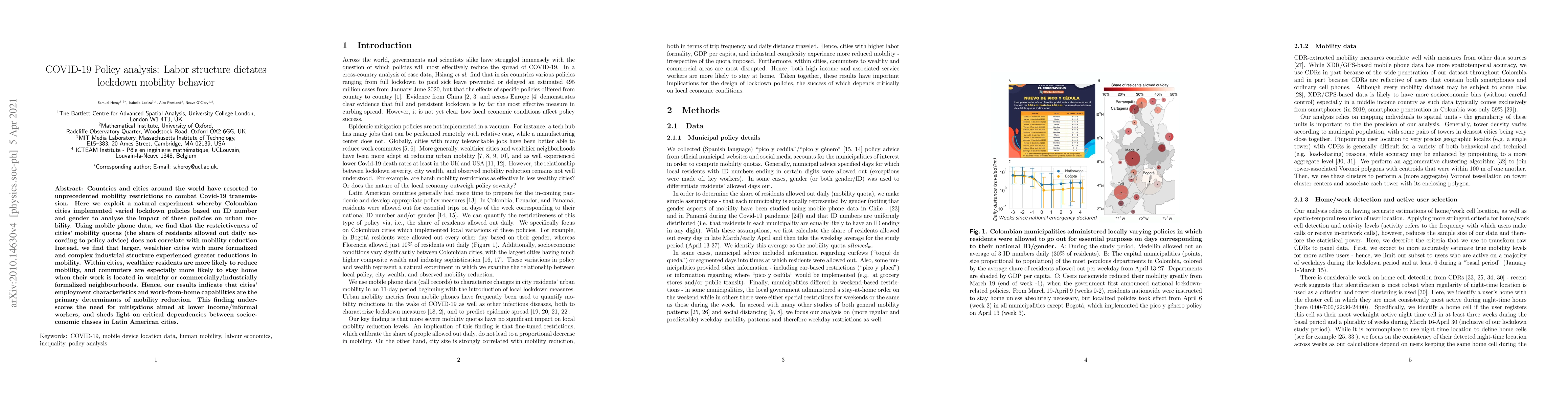 A study analyzing Colombian cities' lockdown policies found that wealthier cities with formalized industries experienced greater mobility reductions, rather than quotas. This highlights the impact of socioeconomic factors on mobility restrictions during COVID-19.