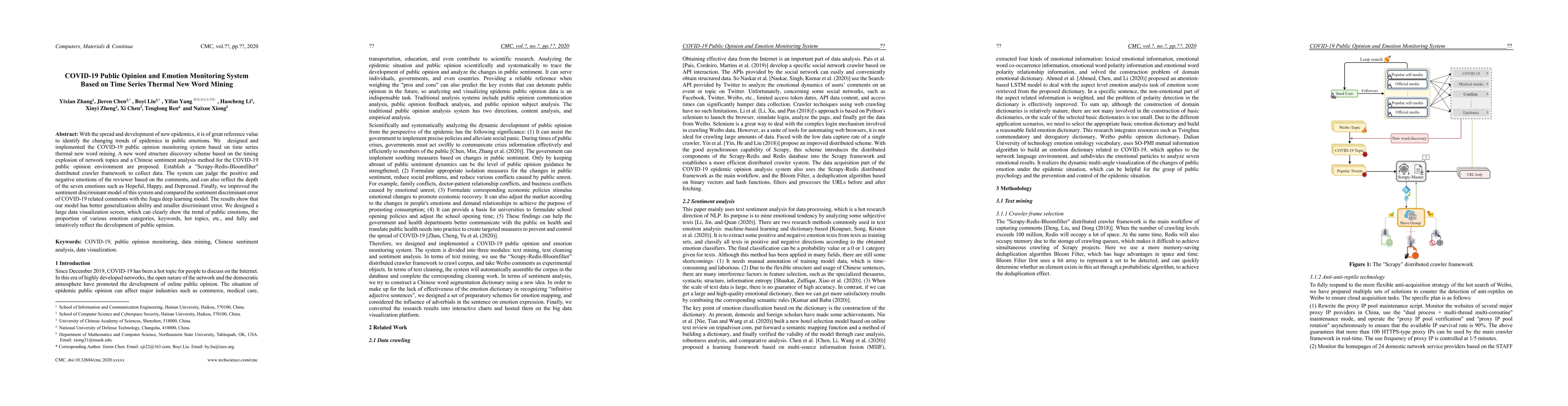 A new system monitors public opinion on COVID-19 using time series thermal word mining, analyzing emotions like hope and depression, and visualizing trends in public sentiment.