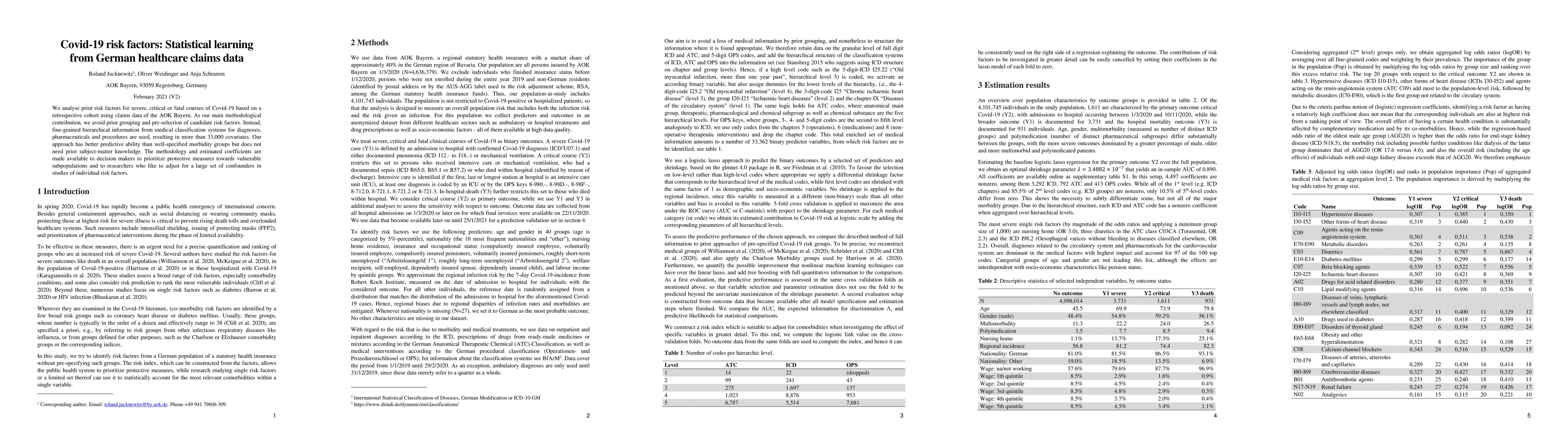 A study analyzed German healthcare claims data to identify Covid-19 risk factors without prior knowledge, finding over 33,000 covariates that improve predictive ability over pre-defined groups.