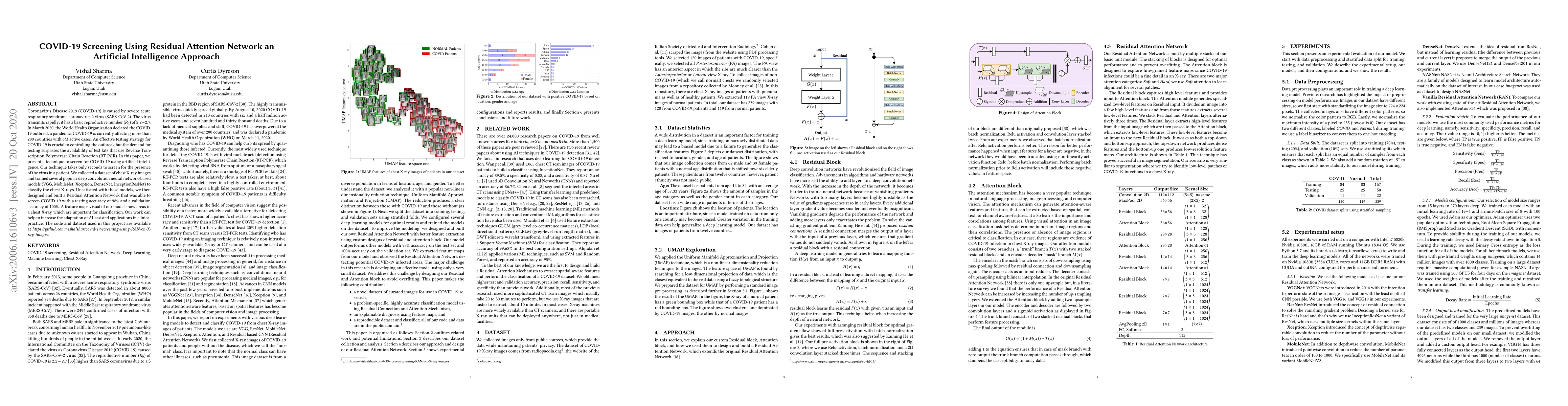Coronavirus Disease 2019 (COVID-19) is caused by severe acute respiratory syndrome coronavirus 2 virus (SARS-CoV-2). The virus transmits rapidly; it has a basic reproductive number R of 2.2-2.7. In March 2020, the World Health Organization declared the COVID-19 outbreak a pandemic. COVID-19 is currently affecting more than 200 countries with 6M active cases. An effective testing strategy for COVID-19 is crucial to controlling the outbreak but the demand for testing surpasses the availability of test kits that use Reverse Transcription Polymerase Chain Reaction (RT-PCR). In this paper, we present a technique to screen for COVID-19 using artificial intelligence. Our technique takes only seconds to screen for the presence of the virus in a patient. We collected a dataset of chest X-ray images and trained several popular deep convolution neural network-based models (VGG, MobileNet, Xception, DenseNet, InceptionResNet) to classify the chest X-rays. Unsatisfied with these models, we then designed and built a Residual Attention Network that was able to screen COVID-19 with a testing accuracy of 98% and a validation accuracy of 100%. A feature maps visual of our model show areas in a chest X-ray which are important for classification. Our work can help to increase the adaptation of AI-assisted applications in clinical practice. The code and dataset used in this project are available at https://github.com/vishalshar/covid-19-screening-using-RAN-on-X-ray-images.