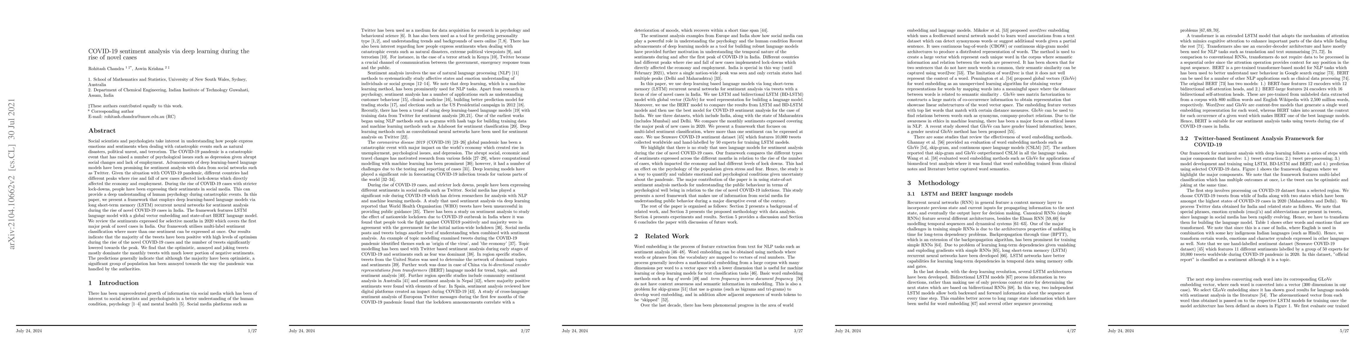 Social scientists and psychologists take interest in understanding how people express emotions and sentiments when dealing with catastrophic events such as natural disasters, political unrest, and terrorism. The COVID-19 pandemic is a catastrophic event that has raised a number of psychological issues such as depression given abrupt social changes and lack of employment. Advancements of deep learning-based language models have been promising for sentiment analysis with data from social networks such as Twitter. Given the situation with COVID-19 pandemic, different countries had different peaks where the rise and fall of new cases affected lock-downs which directly affected the economy and employment. During the rise of COVID-19 cases with stricter lock-downs, people have been expressing their sentiments in social media. This can provide a deep understanding of human psychology during catastrophic events. In this paper, we present a framework that employs deep learning-based language models via long short-term memory (LSTM) recurrent neural networks for sentiment analysis during the rise of novel COVID-19 cases in India. The framework features LSTM language model with a global vector embedding and state-of-art BERT language model. We review the sentiments expressed for selective months in 2020 which covers the first major peak of novel cases in India. Our framework utilises multi-label sentiment classification where more than one sentiment can be expressed at once. Our results indicate that the majority of the tweets have been positive with high levels of optimism during the rise of the novel COVID-19 cases and the number of tweets significantly lowered towards the peak. The predictions generally indicate that although the majority have been optimistic, a significant group of population has been annoyed towards the way the pandemic was handled by the authorities.