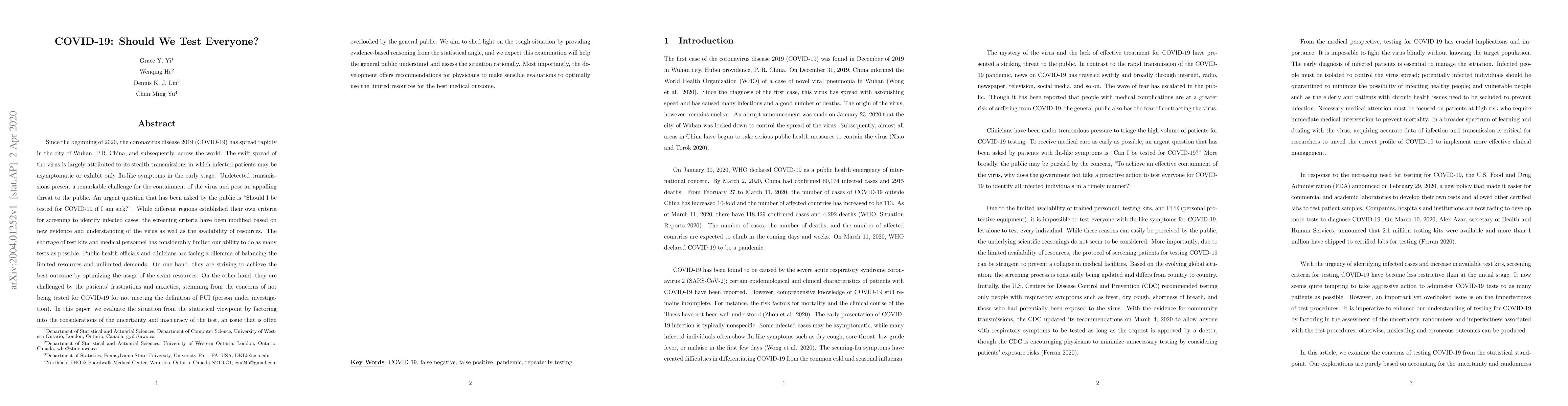 Since the beginning of 2020, the coronavirus disease 2019 (COVID-19) has spread rapidly in the city of Wuhan, P.R. China, and subsequently, across the world. The swift spread of the virus is largely attributed to its stealth transmissions in which infected patients may be asymptomatic. Undetected transmissions present a remarkable challenge for the containment of the virus and pose an appalling threat to the public. An urgent question that has been asked by the public is "Should I be tested for COVID-19 if I am sick?". While different regions established their own criteria for screening infected cases, the screening criteria have been modified based on new evidence and understanding of the virus as well as the availability of resources. The shortage of test kits and medical personnel has considerably limited our ability to do as many tests as possible. Public health officials and clinicians are facing a dilemma of balancing the limited resources and unlimited demands. On one hand, they are striving to achieve the best outcome by optimizing the usage of the scant resources. On the other hand, they are challenged by the patients' frustrations and anxieties, stemming from the concerns of not being tested for COVID-19 for not meeting the definition of PUI (person under investigation). In this paper, we evaluate the situation from the statistical viewpoint by factoring into the considerations of the uncertainty and inaccuracy of the test, an issue that is often overlooked by the general public. We aim to shed light on the tough situation by providing evidence-based reasoning from the statistical angle, and we expect this examination will help the general public understand and assess the situation rationally. Most importantly, the development offers recommendations for physicians to make sensible evaluations to optimally use the limited resources for the best medical outcome.
