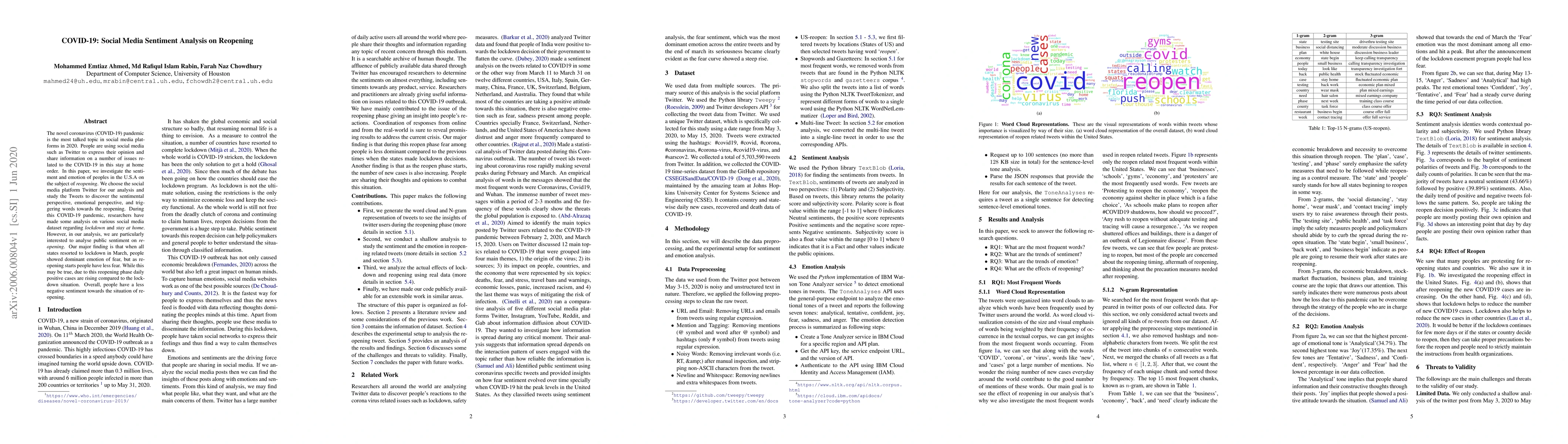 The novel coronavirus (COVID-19) pandemic is the most talked topic in social media platforms in 2020. People are using social media such as Twitter to express their opinion and share information on a number of issues related to the COVID-19 in this stay at home order. In this paper, we investigate the sentiment and emotion of peoples in the United States on the subject of reopening. We choose the social media platform Twitter for our analysis and study the Tweets to discover the sentimental perspective, emotional perspective, and triggering words towards the reopening. During this COVID-19 pandemic, researchers have made some analysis on various social media dataset regarding lockdown and stay at home. However, in our analysis, we are particularly interested to analyse public sentiment on reopening. Our major finding is that when all states resorted to lockdown in March, people showed dominant emotion of fear, but as reopening starts people have less fear. While this may be true, due to this reopening phase daily positive cases are rising compared to the lockdown situation. Overall, people have a less negative sentiment towards the situation of reopening.