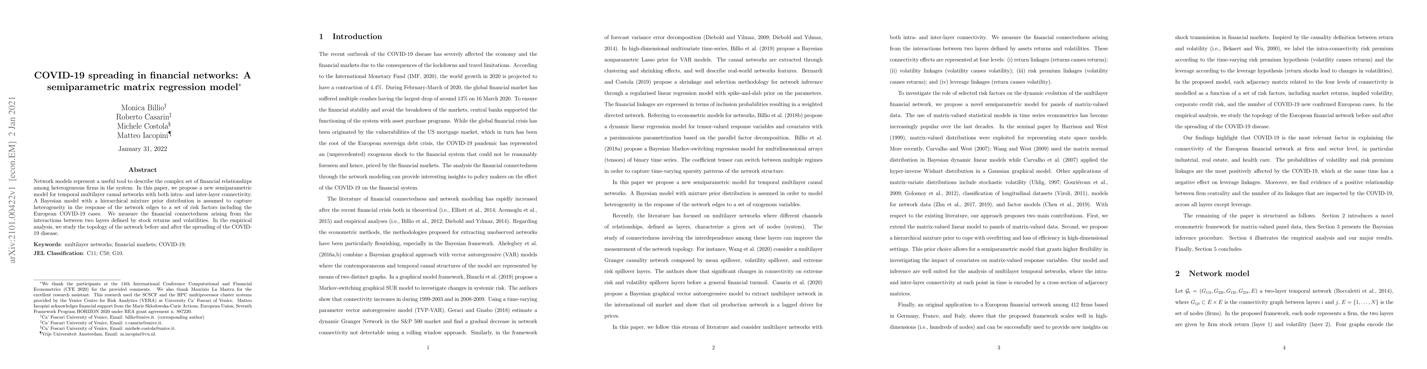 This paper introduces a semiparametric matrix regression model for temporal multilayer causal networks to analyze financial relationships among firms. It employs a Bayesian model with a hierarchical mixture prior to capture the heterogeneity in network responses to risk factors, including the impact of European COVID-19 cases, and examines the financial connectedness between stock returns and volatilities before and after the pandemic.