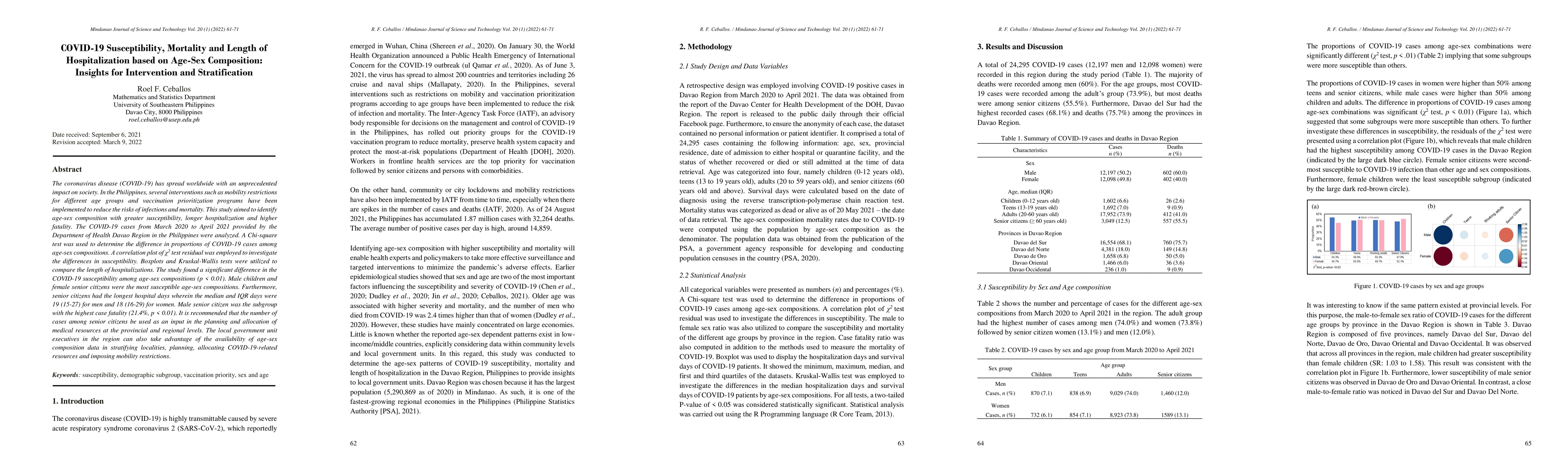 The coronavirus disease (COVID-19) has spread worldwide with an unprecedented impact on society. In the Philippines, several interventions such as mobility restrictions for different age groups and vaccination prioritization programs have been implemented to reduce the risks of infections and mortality. This study aimed to identify age-sex composition with greater susceptibility, longer hospitalization and higher fatality. The COVID-19 cases from March 2020 to April 2021 provided by the Department of Health Davao Region in the Philippines were analyzed. A Chi-square test was used to determine the difference in proportions of COVID-19 cases among age-sex compositions. A correlation plot of \c{hi}2 test residual was employed to investigate the differences in susceptibility. Boxplots and Kruskal-Wallis tests were utilized to compare the length of hospitalizations. The study found a significant difference in the COVID-19 susceptibility among age-sex compositions (p < 0.01). Male children and female senior citizens were the most susceptible age-sex compositions. Furthermore, senior citizens had the longest hospital days wherein the median and IQR days were 19 (15-27) for men and 18 (16-29) for women. Male senior citizen was the subgroup with the highest case fatality (21.4%, p < 0.01). It is recommended that the number of cases among senior citizens be used as an input in the planning and allocation of medical resources at the provincial and regional levels. The local government unit executives in the region can also take advantage of the availability of age-sex composition data in stratifying localities, planning, allocating COVID-19-related resources and imposing mobility restrictions.