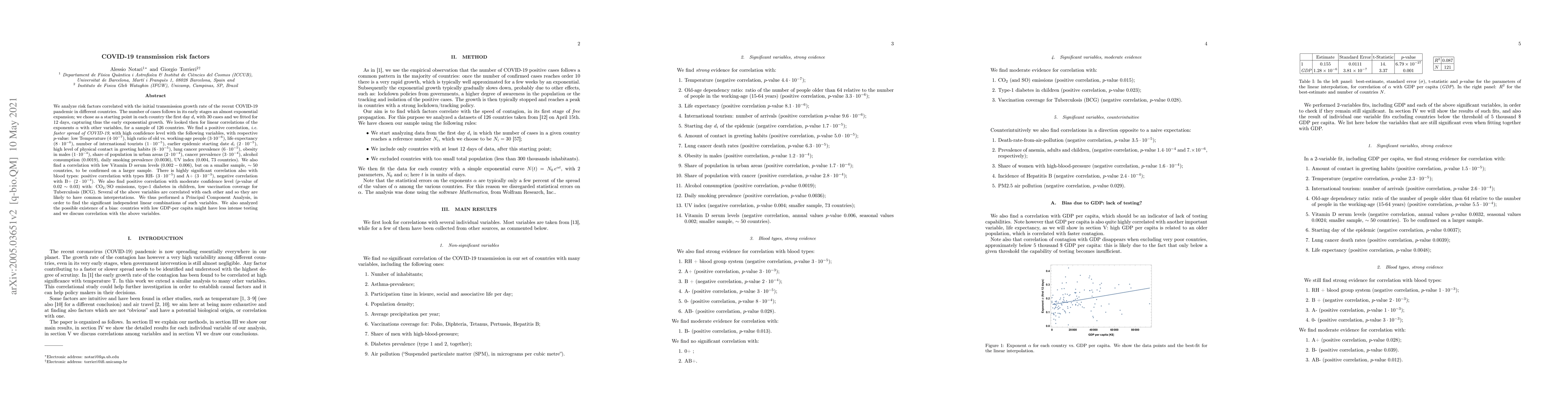 A study analyzed risk factors correlated with COVID-19 transmission growth rates in 126 countries, finding correlations with temperature, demographics, lifestyle habits, and blood types, suggesting that these factors contribute to the spread of the virus.