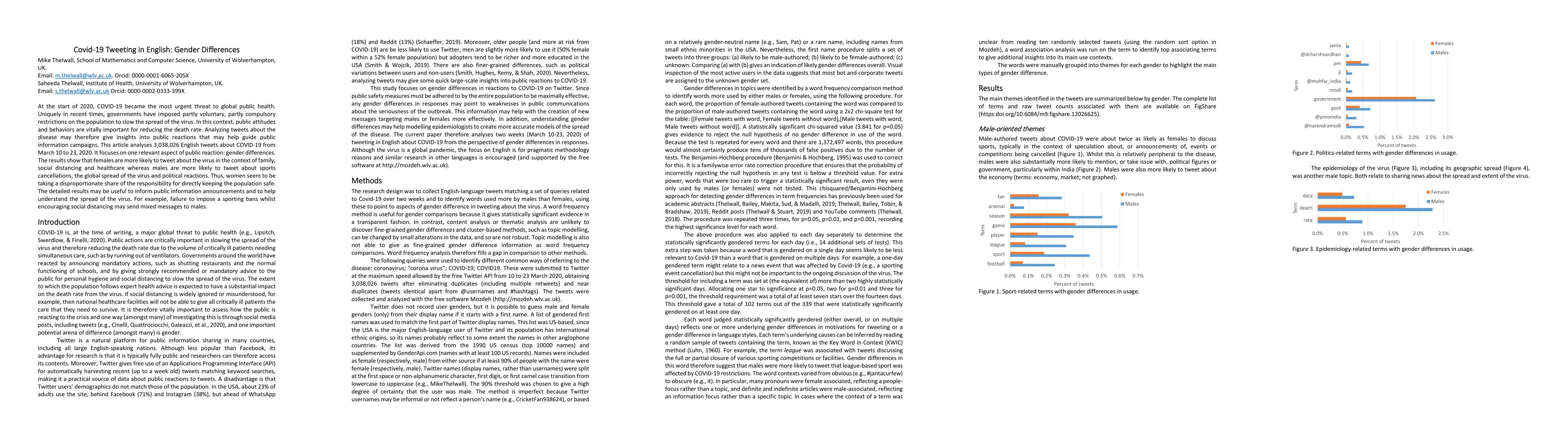 This study analyzes 3,038,026 English COVID-19 tweets from March 10 to 23, 2020, revealing gender differences in public reactions; women tweet more about family, social distancing, and healthcare, while men focus on sports cancellations and political responses. These insights can guide public information campaigns.