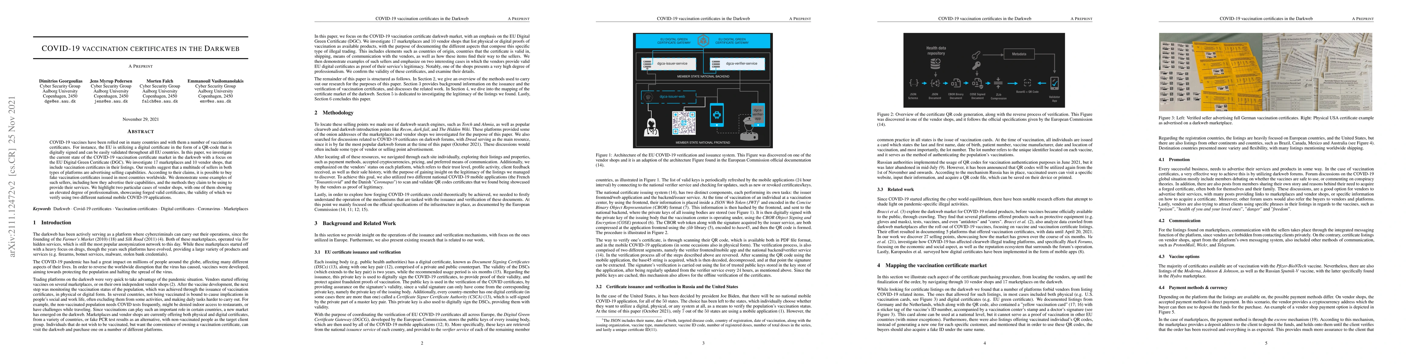 COVID-19 vaccines have been rolled out in many countries and with them a number of vaccination certificates. For instance, the EU is utilizing a digital certificate in the form of a QR-code that is digitally signed and can be easily validated throughout all EU countries. In this paper, we investigate the current state of the COVID-19 vaccination certificate market in the darkweb with a focus on the EU Digital Green Certificate (DGC). We investigate $17$ marketplaces and $10$ vendor shops, that include vaccination certificates in their listings. Our results suggest that a multitude of sellers in both types of platforms are advertising selling capabilities. According to their claims, it is possible to buy fake vaccination certificates issued in most countries worldwide. We demonstrate some examples of such sellers, including how they advertise their capabilities, and the methods they claim to be using to provide their services. We highlight two particular cases of vendor shops, with one of them showing an elevated degree of professionalism, showcasing forged valid certificates, the validity of which we verify using two different national mobile COVID-19 applications.