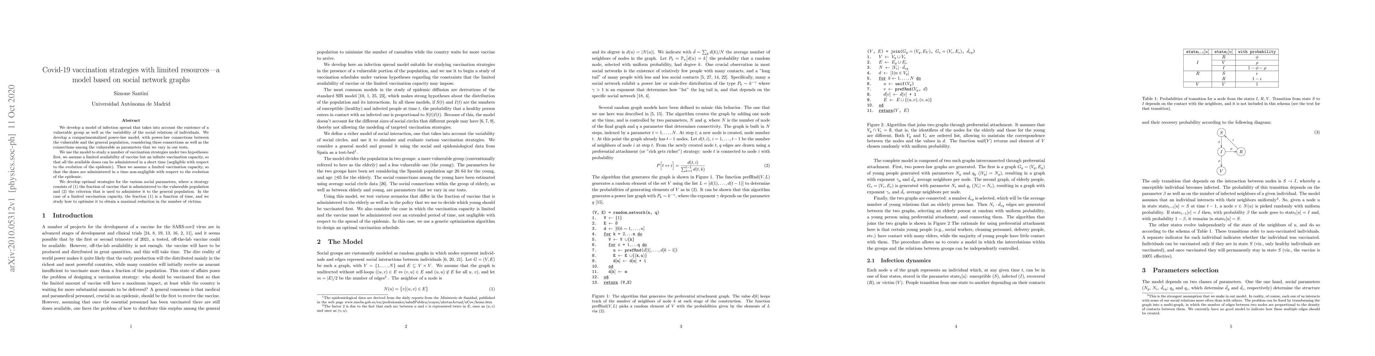 We develop a model of infection spread that takes into account the existence of a vulnerable group as well as the variability of the social relations of individuals. We develop a compartmentalized power-law model, with power-law connections between the vulnerable and the general population, considering these connections as well as the connections among the vulnerable as parameters that we vary in our tests. We use the model to study a number of vaccination strategies under two hypotheses: first, we assume a limited availability of vaccine but an infinite vaccination capacity, so that all the available doses can be administered in a short time (negligible with respect to the evolution of the epidemic). Then we assume a limited vaccination capacity, so that the doses are administered in a time non-negligible with respect to the evolution of the epidemic. We develop optimal strategies for the various social parameters, where a strategy consists of (1) the fraction of vaccine that is administered to the vulnerable population and (2) the criterion that is used to administer it to the general population. In the case of a limited vaccination capacity, the fraction (1) is a function of time, and we study how to optimize it to obtain a maximal reduction in the number of victims.