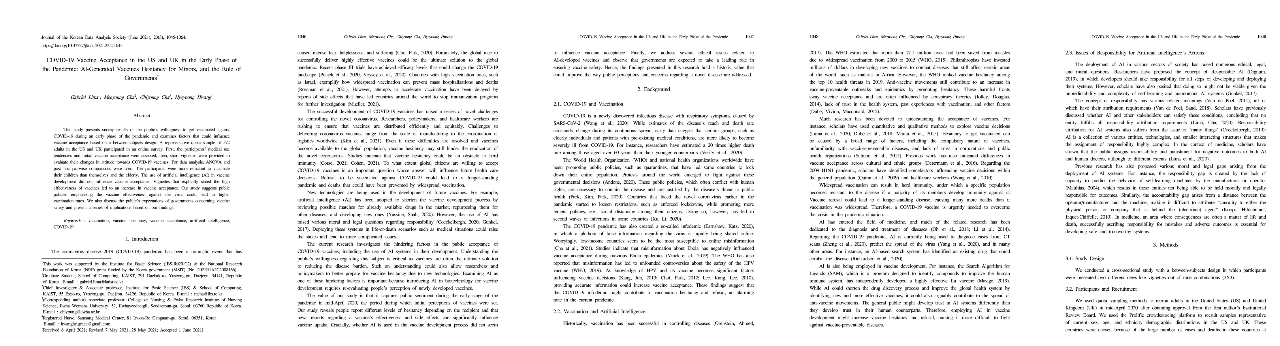 This study surveyed 572 adults in the US and UK to assess COVID-19 vaccine acceptance, finding greater hesitancy towards vaccinating minors. AI-generated vaccine development did not affect acceptance, but emphasizing vaccine effectiveness increased willingness. The study highlights the importance of public policy in promoting vaccine uptake and discusses government roles in ensuring vaccine safety.