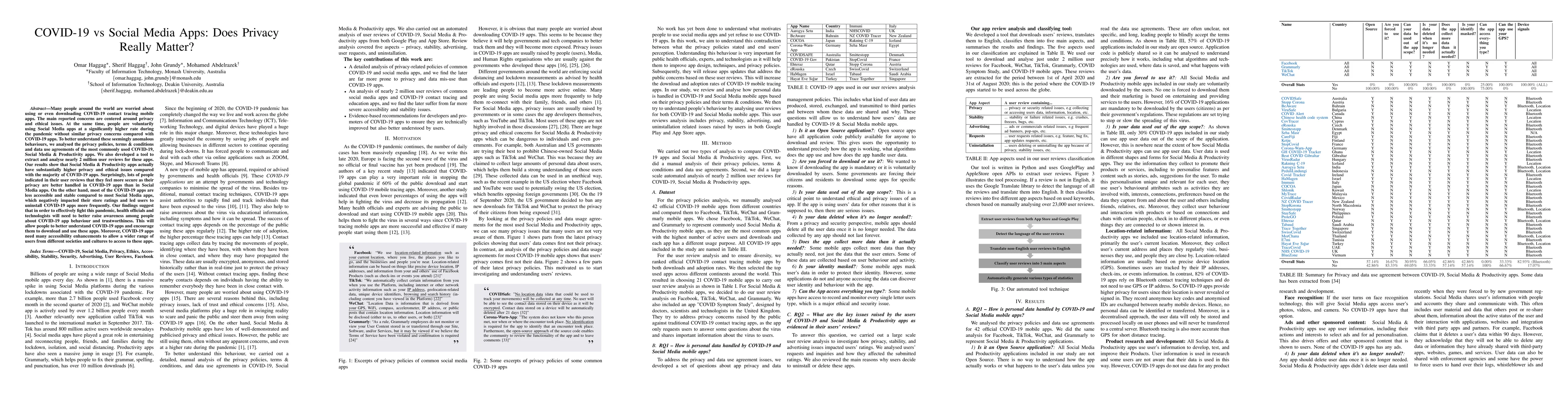 This study investigates privacy concerns surrounding COVID-19 contact tracing apps versus social media apps, revealing that social media apps often have more significant privacy issues. Despite this, users express more trust in COVID-19 apps, while accessibility issues hinder their adoption.