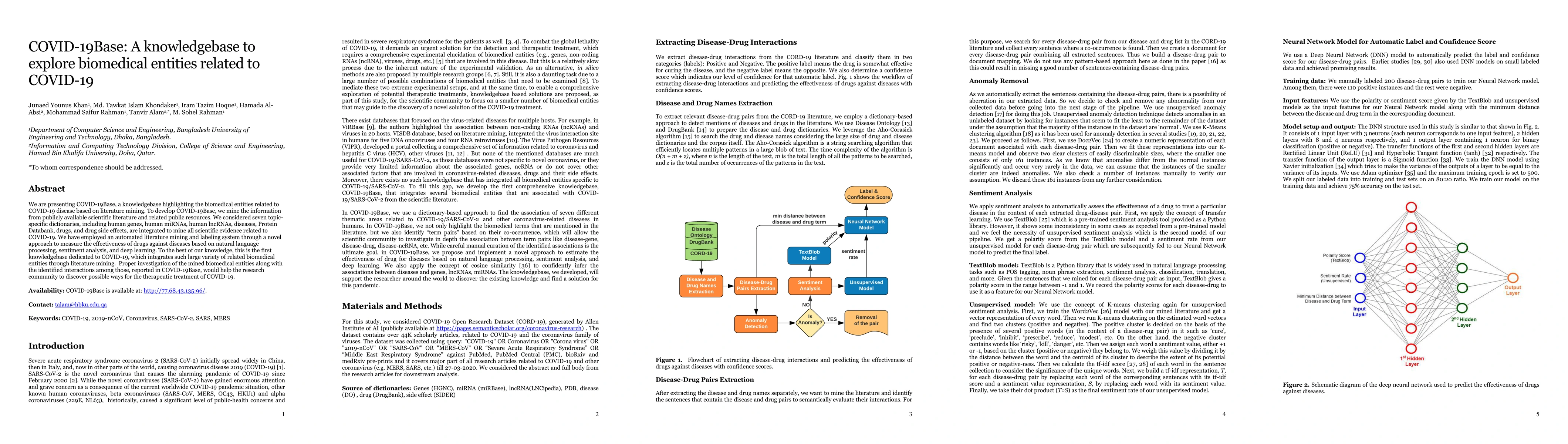 COVID-19Base is a novel knowledgebase developed through literature mining to explore biomedical entities related to COVID-19, integrating diverse data sources like human genes and drugs. It aims to assist researchers in discovering potential therapeutic treatments for COVID-19 by analyzing mined interactions.