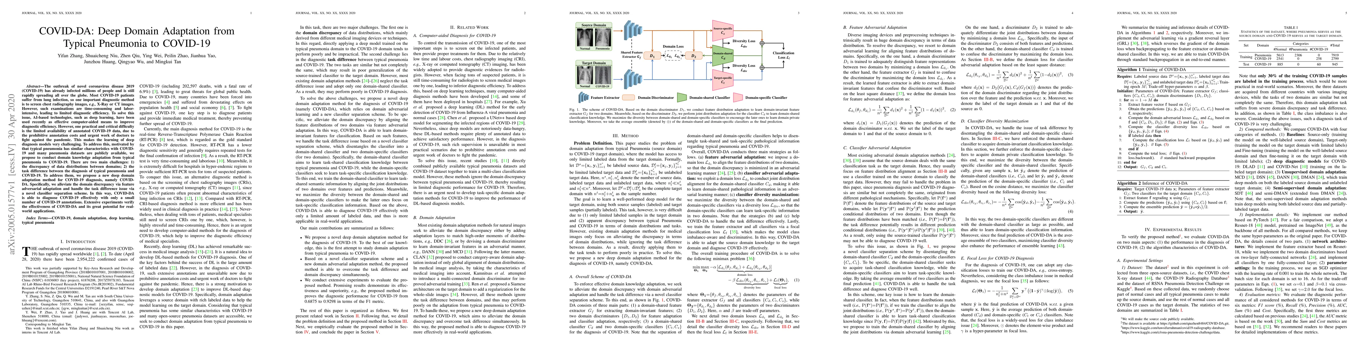 The paper proposes COVID-DA, a deep domain adaptation method to improve COVID-19 diagnosis using limited annotated COVID-19 data by leveraging publicly available typical pneumonia datasets. It addresses domain and task discrepancies through feature adversarial adaptation and classifier separation, demonstrating effectiveness in real-world applications.