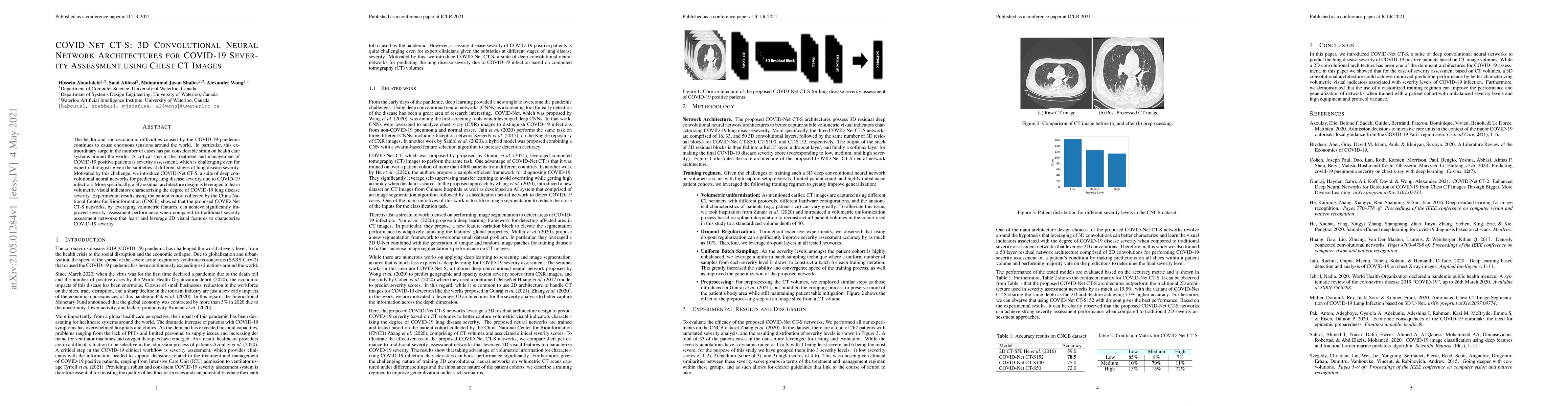 COVID-Net CT-S introduces a suite of 3D convolutional neural networks for assessing COVID-19 lung disease severity from chest CT images, achieving better performance than traditional 2D-based networks, as demonstrated by improved results in a Chinese patient cohort.