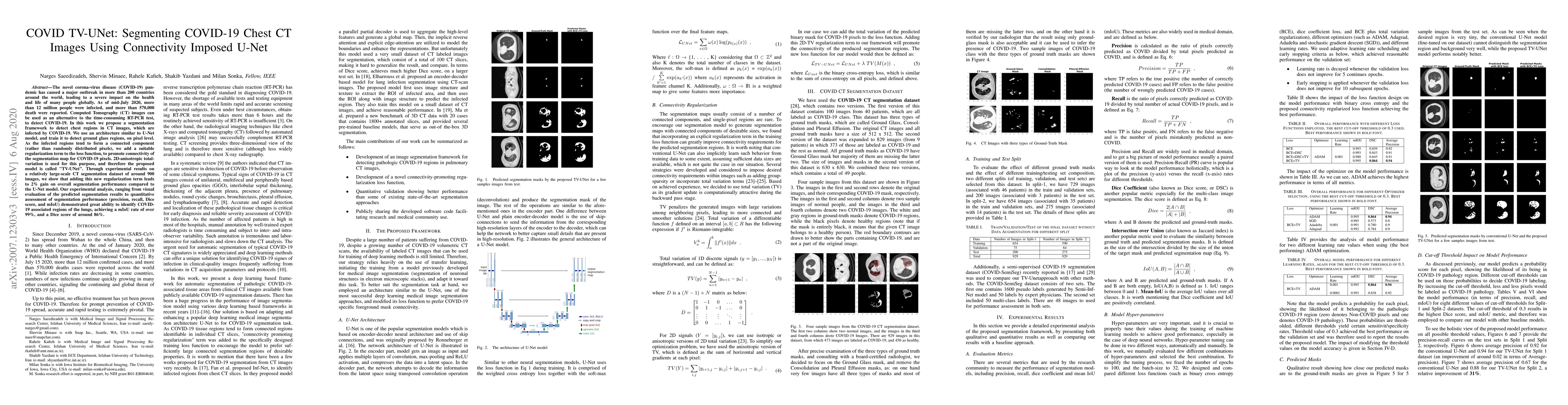 The novel corona-virus disease (COVID-19) pandemic has caused a major outbreak in more than 200 countries around the world, leading to a severe impact on the health and life of many people globally. As of mid-July 2020, more than 12 million people were infected, and more than 570,000 death were reported. Computed Tomography (CT) images can be used as an alternative to the time-consuming RT-PCR test, to detect COVID-19. In this work we propose a segmentation framework to detect chest regions in CT images, which are infected by COVID-19. We use an architecture similar to U-Net model, and train it to detect ground glass regions, on pixel level. As the infected regions tend to form a connected component (rather than randomly distributed pixels), we add a suitable regularization term to the loss function, to promote connectivity of the segmentation map for COVID-19 pixels. 2D-anisotropic total-variation is used for this purpose, and therefore the proposed model is called "TV-UNet". Through experimental results on a relatively large-scale CT segmentation dataset of around 900 images, we show that adding this new regularization term leads to 2\% gain on overall segmentation performance compared to the U-Net model. Our experimental analysis, ranging from visual evaluation of the predicted segmentation results to quantitative assessment of segmentation performance (precision, recall, Dice score, and mIoU) demonstrated great ability to identify COVID-19 associated regions of the lungs, achieving a mIoU rate of over 99\%, and a Dice score of around 86\%.