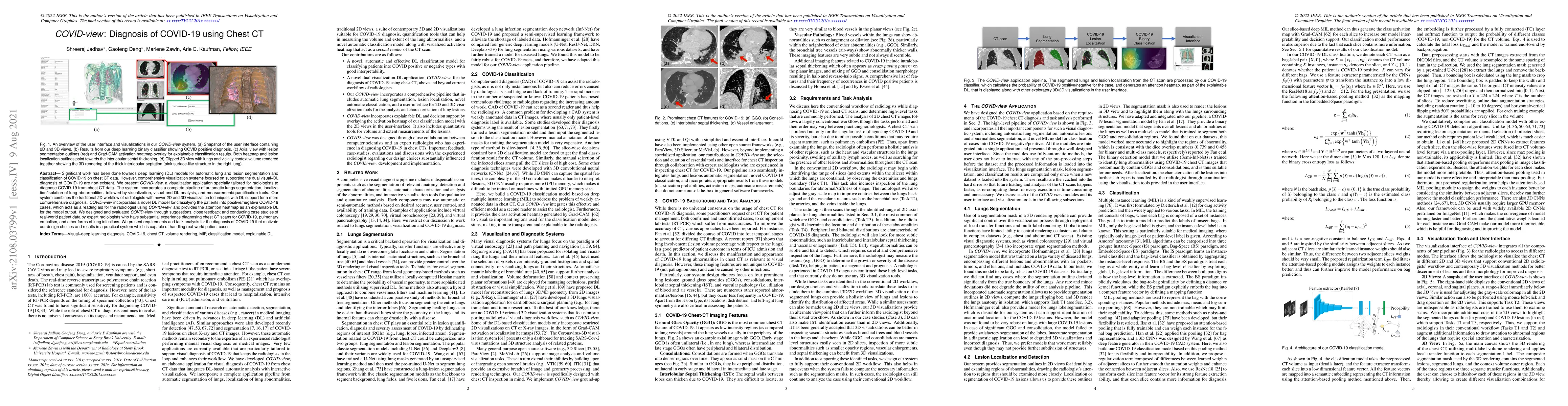 COVID-view is a visualization application designed to assist radiologists in diagnosing COVID-19 from chest CT data, integrating deep learning models for automatic lung segmentation and classification, alongside traditional 2D and 3D visualization techniques. The system provides a comprehensive pipeline for visual and DL analysis, aiding in the accurate diagnosis of COVID-19 through expert feedback and real-world case studies.