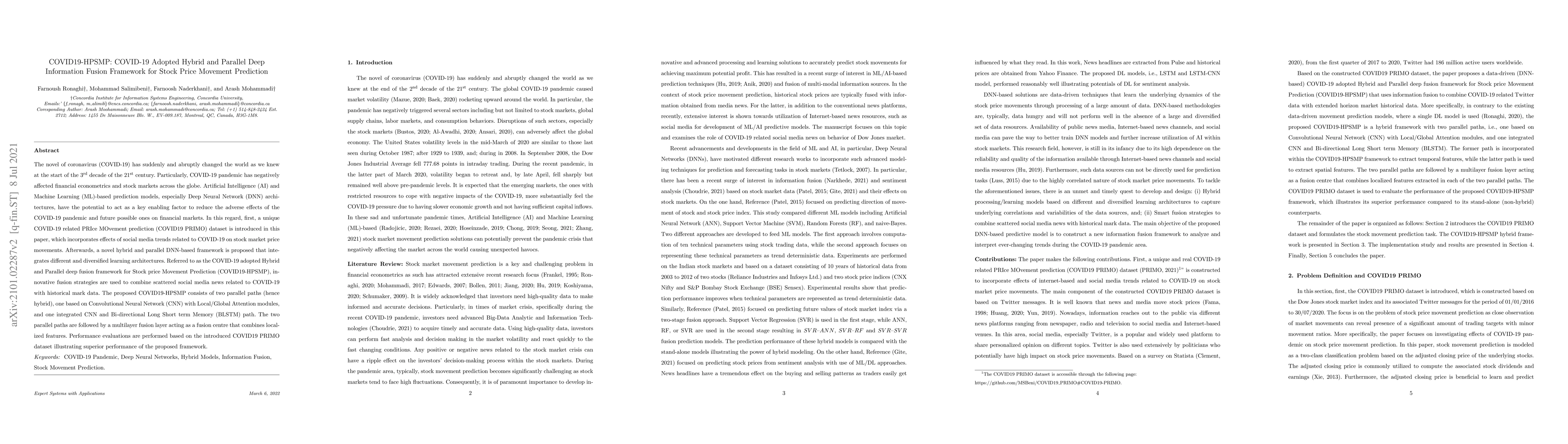 The novel of coronavirus (COVID-19) has suddenly and abruptly changed the world as we knew at the start of the 3rd decade of the 21st century. Particularly, COVID-19 pandemic has negatively affected financial econometrics and stock markets across the globe. Artificial Intelligence (AI) and Machine Learning (ML)-based prediction models, especially Deep Neural Network (DNN) architectures, have the potential to act as a key enabling factor to reduce the adverse effects of the COVID-19 pandemic and future possible ones on financial markets. In this regard, first, a unique COVID-19 related PRIce MOvement prediction (COVID19 PRIMO) dataset is introduced in this paper, which incorporates effects of social media trends related to COVID-19 on stock market price movements. Afterwards, a novel hybrid and parallel DNN-based framework is proposed that integrates different and diversified learning architectures. Referred to as the COVID-19 adopted Hybrid and Parallel deep fusion framework for Stock price Movement Prediction (COVID19-HPSMP), innovative fusion strategies are used to combine scattered social media news related to COVID-19 with historical mark data. The proposed COVID19-HPSMP consists of two parallel paths (hence hybrid), one based on Convolutional Neural Network (CNN) with Local/Global Attention modules, and one integrated CNN and Bi-directional Long Short term Memory (BLSTM) path. The two parallel paths are followed by a multilayer fusion layer acting as a fusion centre that combines localized features. Performance evaluations are performed based on the introduced COVID19 PRIMO dataset illustrating superior performance of the proposed framework.
