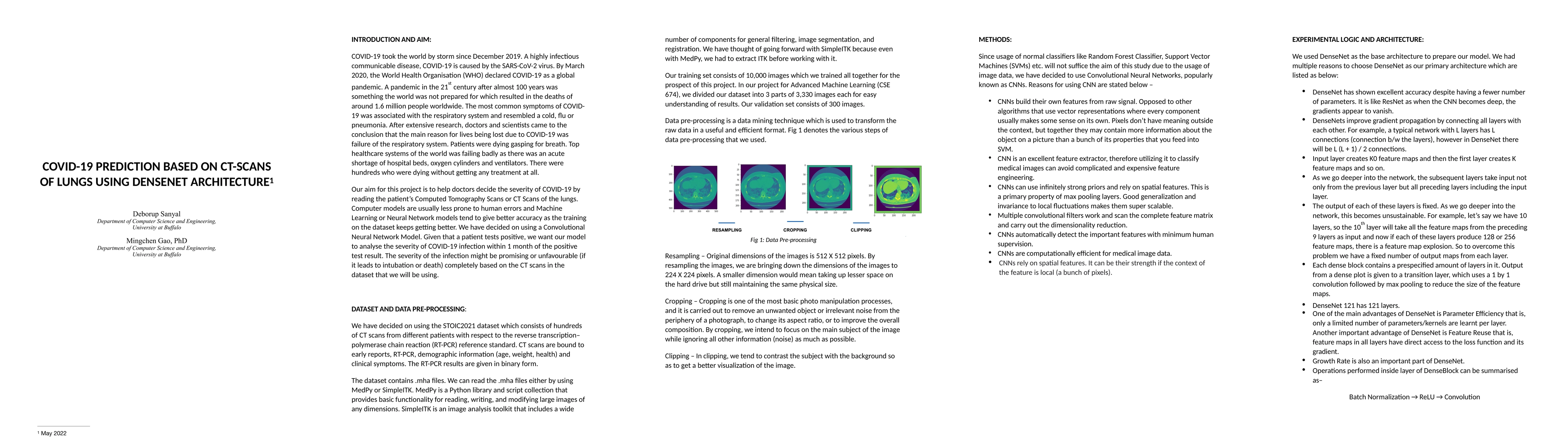 COVID19 took the world by storm since December 2019. A highly infectious communicable disease, COVID19 is caused by the SARSCoV2 virus. By March 2020, the World Health Organization (WHO) declared COVID19 as a global pandemic. A pandemic in the 21st century after almost 100 years was something the world was not prepared for, which resulted in the deaths of around 1.6 million people worldwide. The most common symptoms of COVID19 were associated with the respiratory system and resembled a cold, flu, or pneumonia. After extensive research, doctors and scientists concluded that the main reason for lives being lost due to COVID19 was failure of the respiratory system. Patients were dying gasping for breath. Top healthcare systems of the world were failing badly as there was an acute shortage of hospital beds, oxygen cylinders, and ventilators. Many were dying without receiving any treatment at all. The aim of this project is to help doctors decide the severity of COVID19 by reading the patient's Computed Tomography (CT) scans of the lungs. Computer models are less prone to human error, and Machine Learning or Neural Network models tend to give better accuracy as training improves over time. We have decided to use a Convolutional Neural Network model. Given that a patient tests positive, our model will analyze the severity of COVID19 infection within one month of the positive test result. The severity of the infection may be promising or unfavorable (if it leads to intubation or death), based entirely on the CT scans in the dataset.