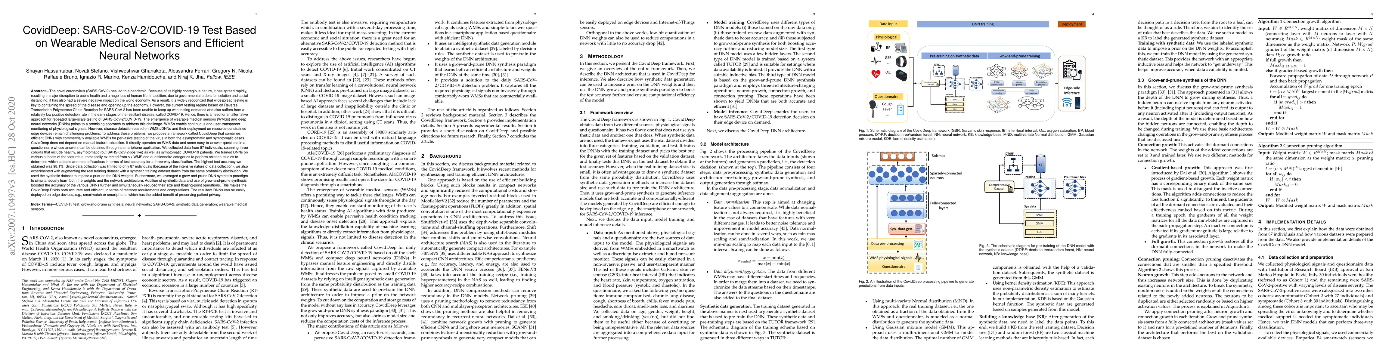 The novel coronavirus (SARS-CoV-2) has led to a pandemic. The current testing regime based on Reverse Transcription-Polymerase Chain Reaction for SARS-CoV-2 has been unable to keep up with testing demands, and also suffers from a relatively low positive detection rate in the early stages of the resultant COVID-19 disease. Hence, there is a need for an alternative approach for repeated large-scale testing of SARS-CoV-2/COVID-19. We propose a framework called CovidDeep that combines efficient DNNs with commercially available WMSs for pervasive testing of the virus. We collected data from 87 individuals, spanning three cohorts including healthy, asymptomatic, and symptomatic patients. We trained DNNs on various subsets of the features automatically extracted from six WMS and questionnaire categories to perform ablation studies to determine which subsets are most efficacious in terms of test accuracy for a three-way classification. The highest test accuracy obtained was 98.1%. We also augmented the real training dataset with a synthetic training dataset drawn from the same probability distribution to impose a prior on DNN weights and leveraged a grow-and-prune synthesis paradigm to learn both DNN architecture and weights. This boosted the accuracy of the various DNNs further and simultaneously reduced their size and floating-point operations.