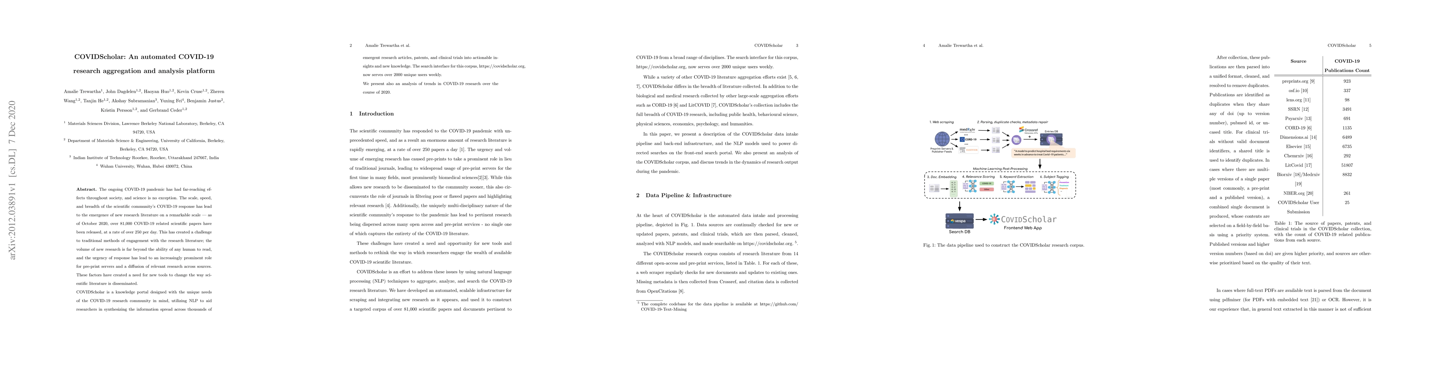 COVIDScholar is an automated platform that aggregates and analyzes COVID-19 research literature using NLP to synthesize information from thousands of articles, patents, and trials. It serves over 2000 users weekly, aiding in the dissemination of emergent COVID-19 research insights.