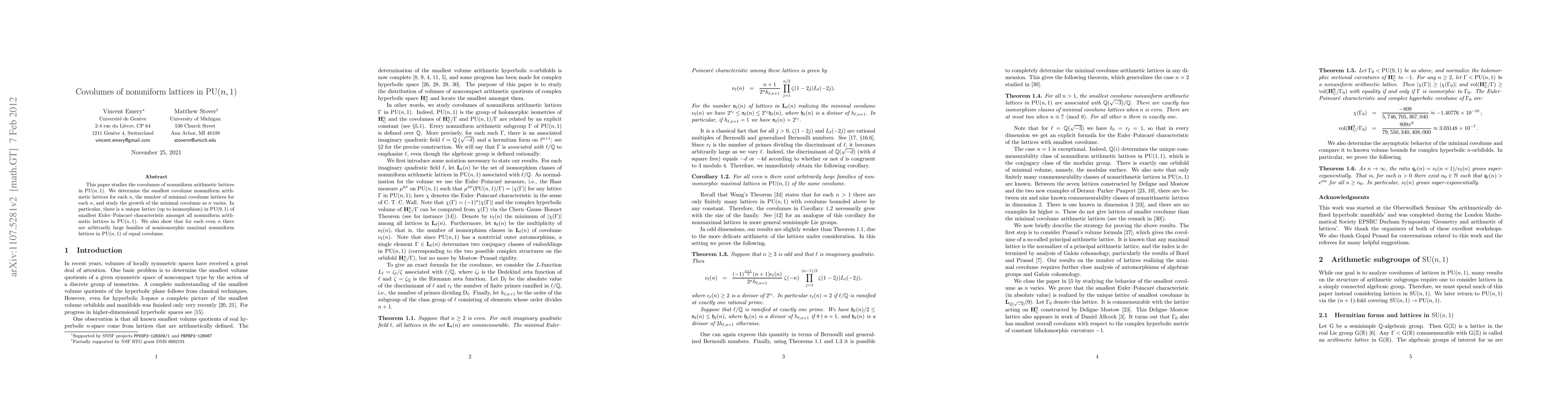 This paper investigates covolumes of nonuniform arithmetic lattices in PU(n, 1), identifying the smallest covolume lattices for each n, their count, and minimal covolume growth trends. Notably, it finds a unique lattice in PU(9, 1) with the smallest Euler-Poincaré characteristic and shows that for even n, there exist infinitely many nonisomorphic maximal lattices of equal covolume.