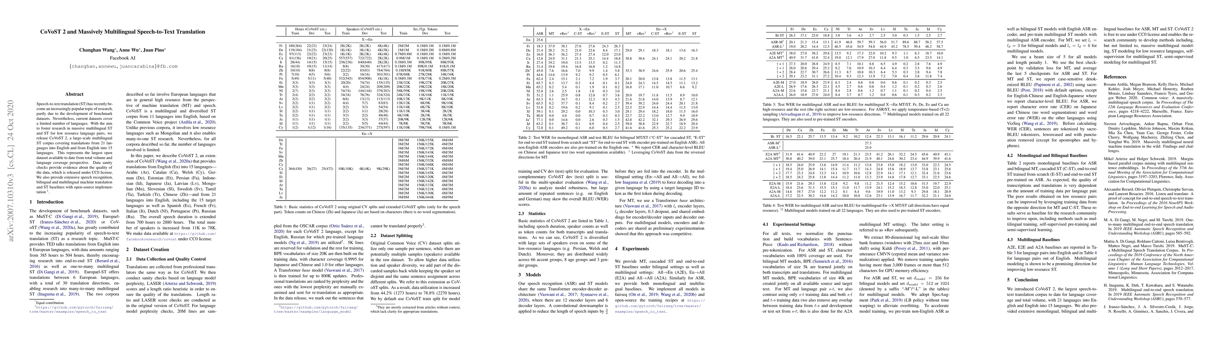 The paper introduces CoVoST 2, an expansive multilingual speech translation corpus with translations across 21 languages to English and 15 languages from English, aiming to promote research in low-resource language pairs. The dataset, released under CC0, includes quality data checks and offers baseline models for speech recognition and translation.