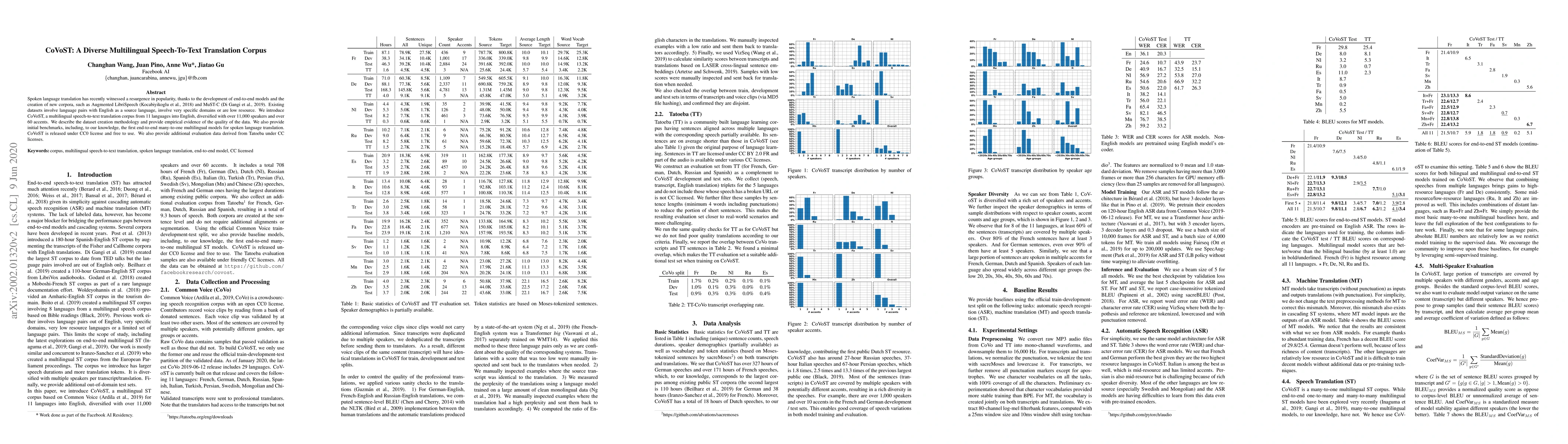 CoVoST is a new multilingual speech-to-text translation corpus containing recordings from 11 languages translated into English, featuring diverse speakers and accents. The paper presents the dataset creation methodology and provides initial benchmarks for multilingual spoken language translation.