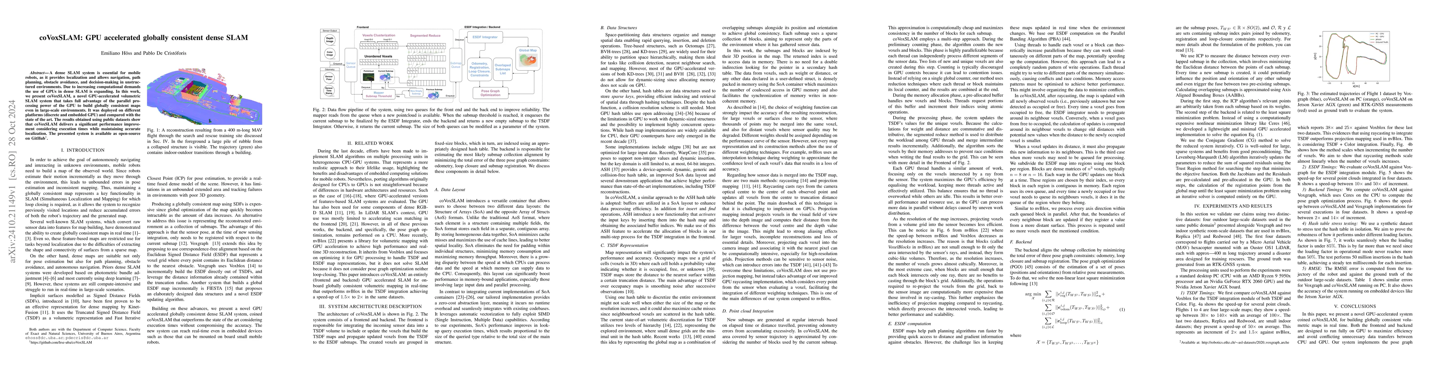 coVoxSLAM is a GPU-accelerated dense SLAM system that leverages parallel processing to create globally consistent maps, significantly improving performance over state-of-the-art methods while maintaining accurate localization in large-scale environments. It is open-source and available on GitHub.