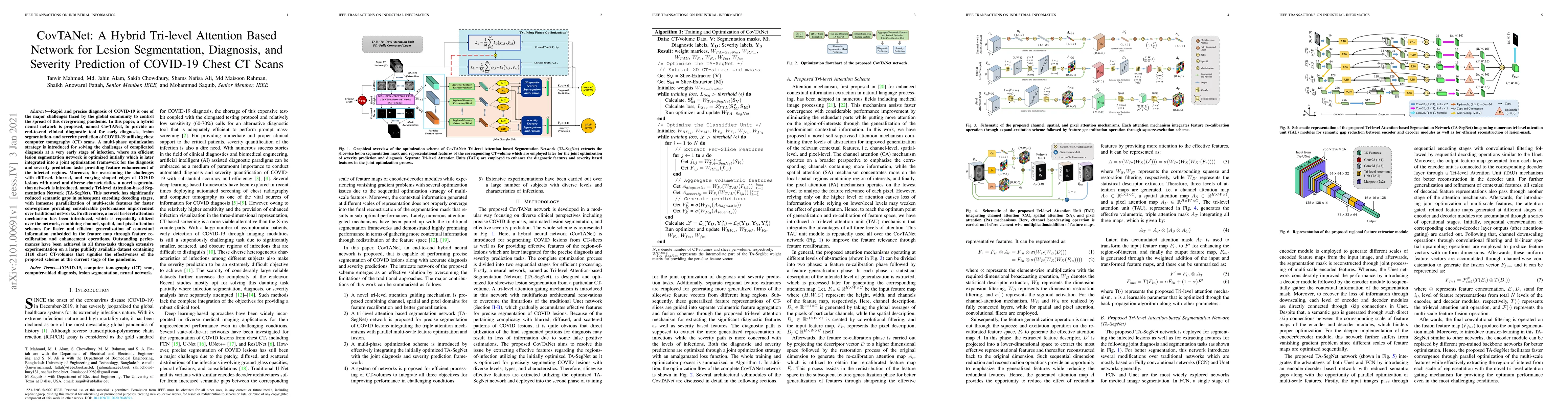 CovTANet is a hybrid neural network designed for early diagnosis, lesion segmentation, and severity prediction of COVID-19 using chest CT scans. It employs a Tri-level Attention-based Segmentation Network for enhanced lesion segmentation, achieving superior performance through multi-scale feature parallelization and a novel tri-level attention mechanism.