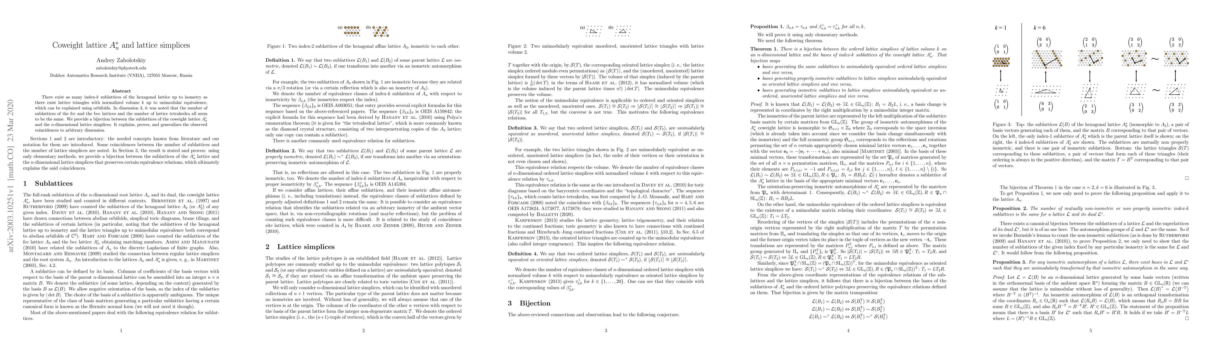 There exist as many index-$k$ sublattices of the hexagonal lattice up to isometry as there exist lattice triangles with normalized volume $k$ up to unimodular equivalence, which can be explained using orbifolds. In dimension 3, it was noted that the number of sublattices of the fcc and the bcc lattices and the number of lattice tetrahedra all seem to be the same. We provide a bijection between the sublattices of the coweight lattice $A^*_n$ and the $n$-dimensional lattice simplices. It explains, proves, and generalizes the observed coincidences to arbitrary dimension.