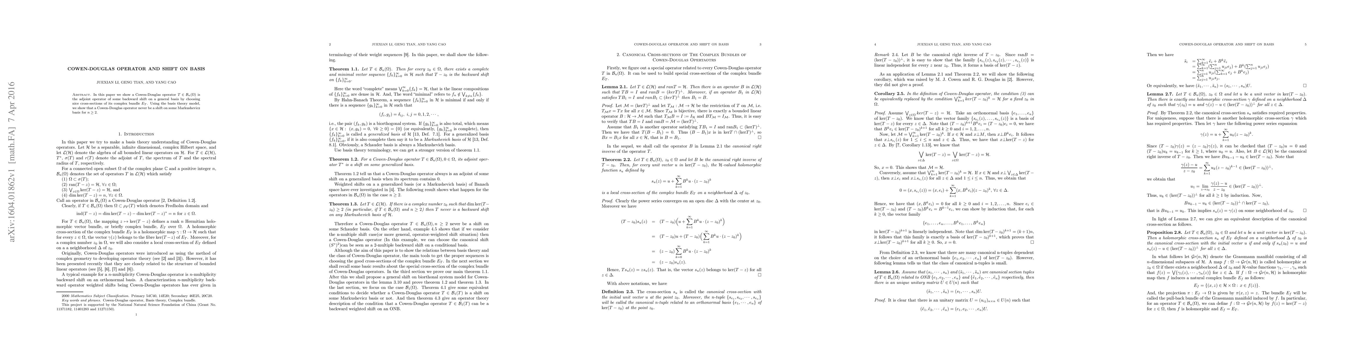 In this paper we show a Cowen-Douglas operator $T \in \mathcal{B}_{n}(\Omega)$ is the adjoint operator of some backward shift on a general basis by choosing nice cross-sections of its complex bundle $E_{T}$. Using the basis theory model, we show that a Cowen-Douglas operator never be a shift on some Markushevicz basis for $n \ge 2$.