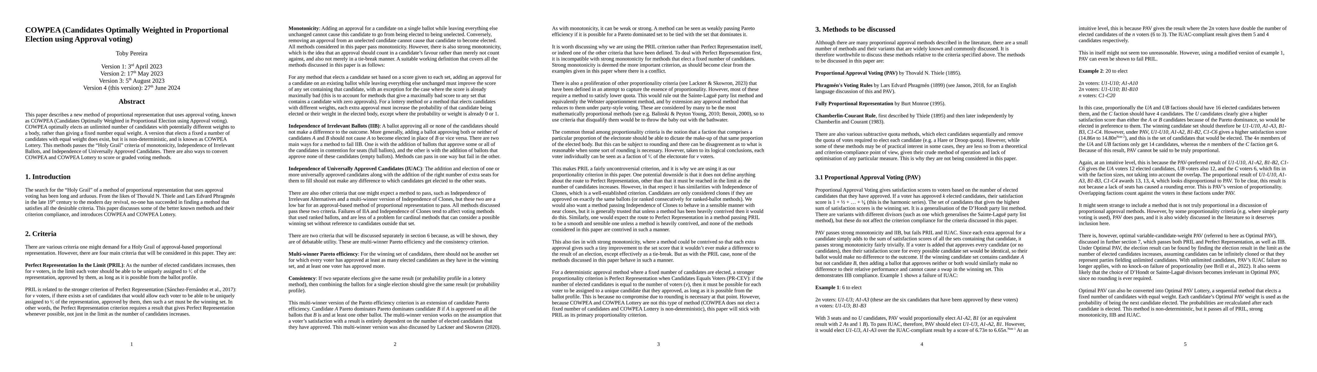 COWPEA is a novel proportional representation method using approval voting to elect a flexible number of candidates with varying weights, surpassing "Holy Grail" criteria like monotonicity. It can also be converted to score voting systems.