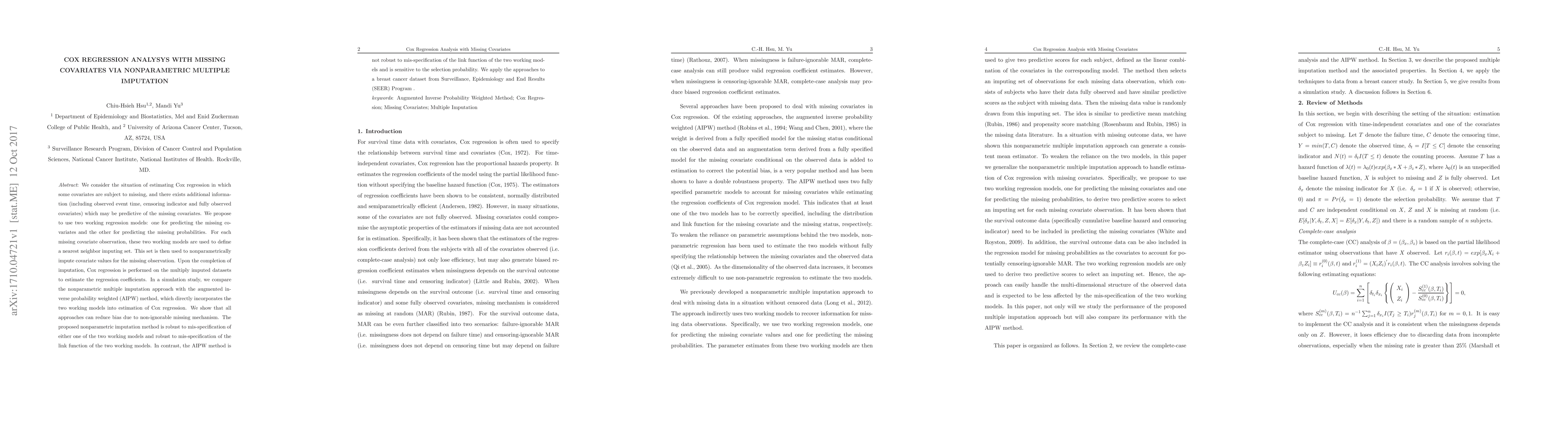 This paper proposes a nonparametric multiple imputation method for Cox regression analysis when some covariates are missing, using two working regression models to predict missing values. The method is shown to be robust to model mis-specification and is compared favorably to the augmented inverse probability weighted method in simulations and a breast cancer dataset.