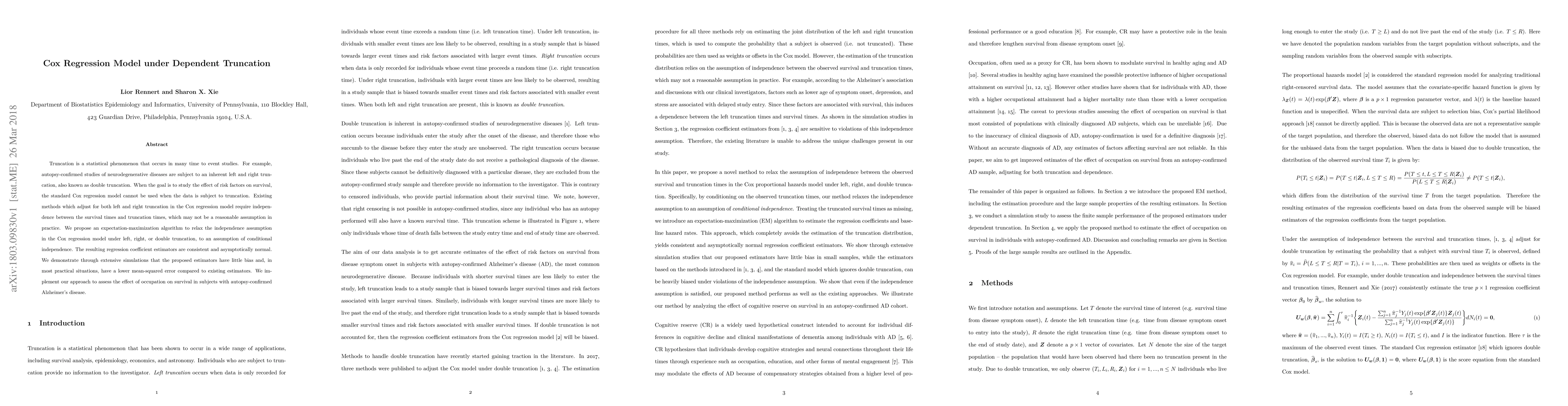 This paper proposes an expectation-maximization algorithm to adjust Cox regression for data subject to left, right, or double truncation, relaxing the independence assumption to conditional independence. The method shows little bias and lower mean-squared error in simulations, and is applied to assess occupational effects on Alzheimer's disease survival.