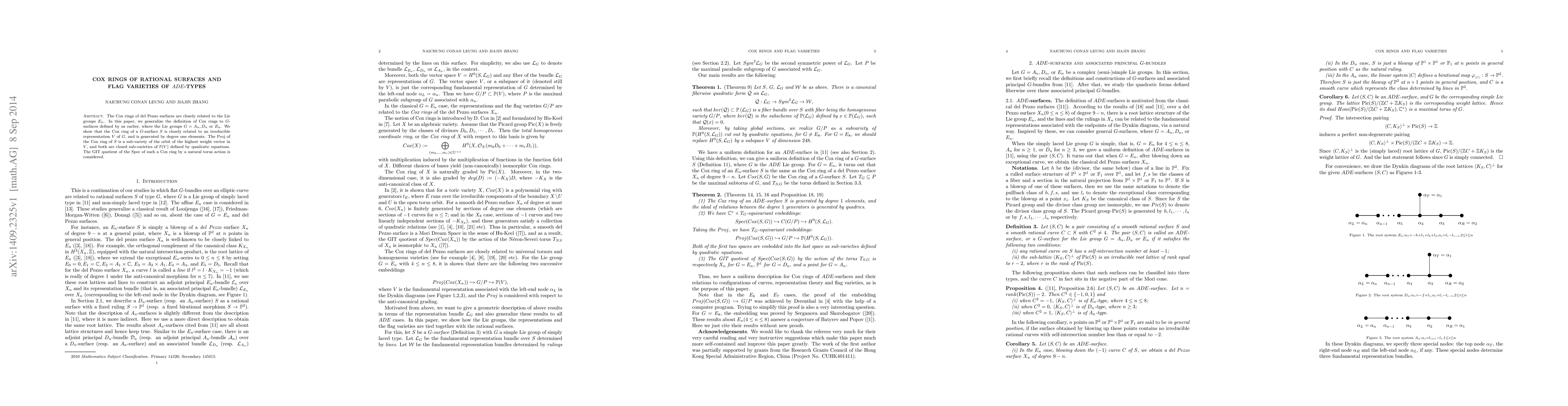 The Cox rings of del Pezzo surfaces are closely related to the Lie groups E_n. In this paper, we generalize the definition of Cox rings to G- surfaces defined by us earlier, where the Lie groups G=A_n, D_n or E_n. We show that the Cox ring of a G-surface S is almost determined by an irreducible representation V of G, and is generated by degree one elements. The Proj of this ring is a sub-variety of the orbit of the highest weight vector in V, and both are closed sub-varieties of the projective space P(V) defined by quadratic equations.